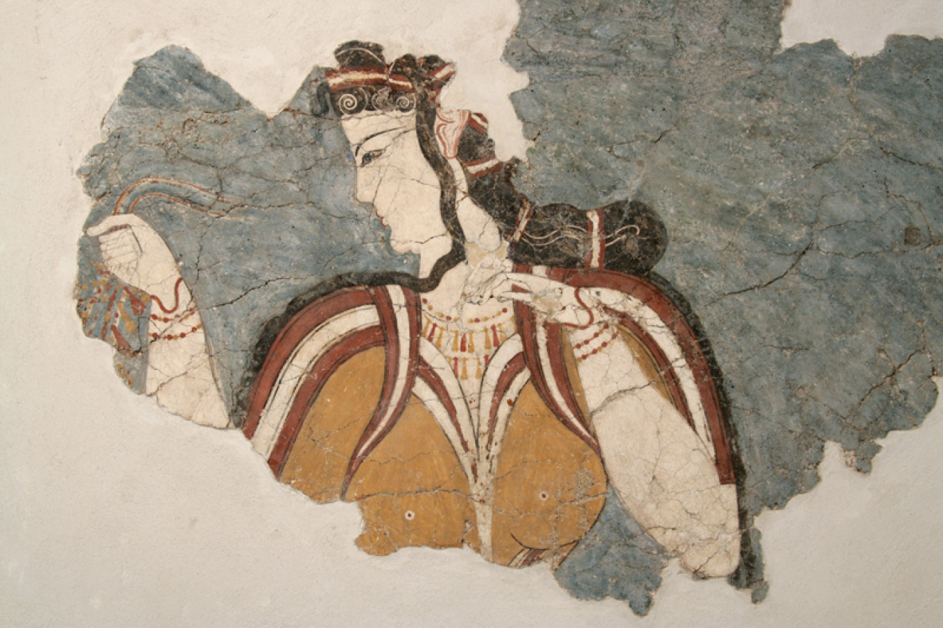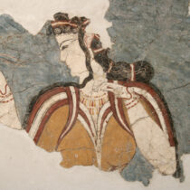 «Μια στάση στην προθήκη 20 θα σας επιτρέψει να θαυμάσετε την περίφημη τοιχογραφία της λεγόμενης “Μυκηναίας” (εικ. 1) που προέρχεται από το Θρησκευτικό Κέντρο των Μυκηνών και χρονολογείται στον 13ο αι. π.Χ. Προσέξτε την περίτεχνη κόμμωση που δένει με υφασμάτινες κορδέλες, δείτε το κομψό κοντό γιλέκο, τα πολύχρωμα περιδέραια. Παρατηρήστε τα μάτια, τα καλοσχηματισμένα φρύδια και τα κόκκινα χείλη που μοιάζουν να υπομειδιούν από ευχαρίστηση, ίσως γιατί της έχουν προσφέρει το περιδέραιο που κρατάει στο δεξί της χέρι. Θεά ή ιέρεια, η Μυκηναία του Εθνικού Αρχαιολογικού Μουσείου εκφράζει αναμφίβολα ένα γυναικείο πρότυπο της εποχής της, ένα ιδεώδες ομορφιάς και γυναικείας καλαισθησίας που φαίνεται ότι θα κυριαρχήσει για πολλούς αιώνες αργότερα», τονίζει η επίτιμη διευθύντρια.