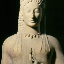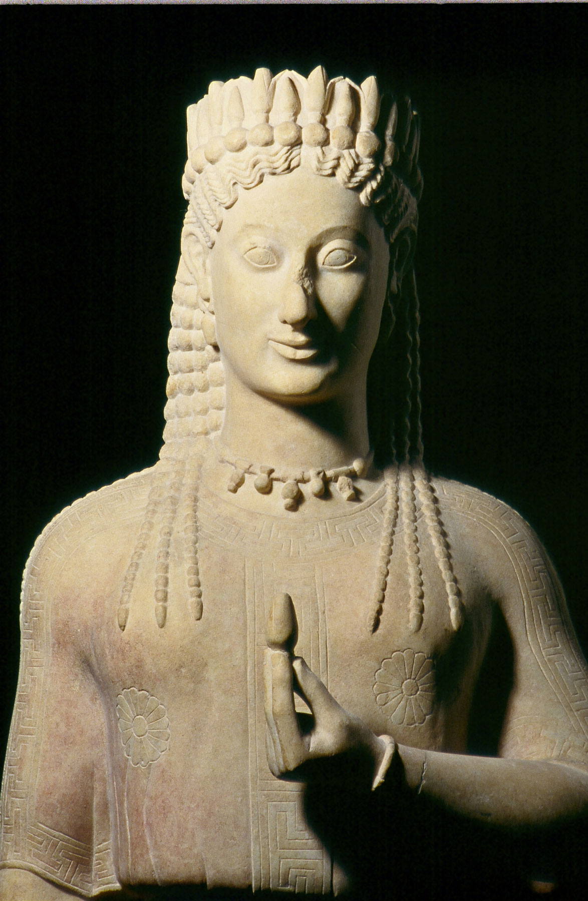Οι αρχαϊκοί χρόνοι φέρνουν και τη μνημειώδη γλυπτική. «Τον αρχετυπικό τρόπο απόδοσης της γυναικείας μορφής θα ακολουθήσει η μνημειώδης γλυπτική των αρχαϊκών χρόνων (700-500 π.Χ.), όπως εκφράζεται με τους γυμνούς Κούρους και τις καλαίσθητα ντυμένες Κόρες. Η τέχνη μοιάζει τώρα να σφραγίζεται από το ξύπνημα της ατομικής συνείδησης. Σε αυτό το κλίμα εντάσσονται οι επιγραφές που συνοδεύουν πολλά έργα και αναφέρουν τα ονόματα των εικονιζομένων, των αναθετών και των καλλιτεχνών», επισημαίνει η συνομιλήτρια του ΑΠΕ-ΜΠΕ, επιλέγοντας να παρουσιάσει ένα άγαλμα στο οποίο τόσο η θεότητα που απεικονίζει όσο και το πρόσωπο που το αφιέρωσε είναι γένους θηλυκού. «Χαρακτηριστικό παράδειγμα αποτελεί το μαρμάρινο γυναικείο άγαλμα που υποδέχεται τον επισκέπτη στην αίθουσα 7 του Εθνικού Αρχαιολογικού Μουσείου. Το άγαλμα, που απεικονίζει πιθανότατα τη θεά Άρτεμη, αφιερώθηκε στο ιερό της στη Δήλο και χρονολογείται γύρω στο 660 π.Χ. Αναθέτρια ήταν μια επιφανής γυναίκα της Νάξου, η Νικάνδρη. Η τρίστιχη επιγραφή σε δακτυλικό εξάμετρο που είναι χαραγμένη βουστροφηδόν στην αριστερή πλευρά του κάτω κορμού της αποκαλύπτει την κοινωνική θέση της γυναίκας που δηλώνει σπουδαία και περήφανη για όσα πέτυχε στη ζωή της: “Η Νικάνδρη με αφιέρωσε στην εύστοχη τοξότιδα, η κόρη του Δεινοδίκαιου από τη Νάξο, η πιο σπουδαία ανάμεσα στις άλλες, αδελφή του Δεινομέδους και τώρα γυναίκα του Φράξου”».