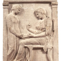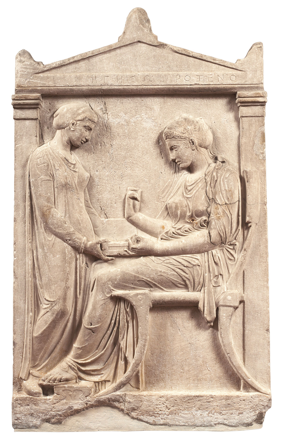 Ανάλογα θλιμμένη είναι και η ιστορία της γυναίκας που μας περιμένει στην αίθουσα 18 (εικ. 3). Περιγράφει η Μ. Λαγογιάννη: «Η μαρμάρινη επιτύμβια στήλη που προέρχεται από το νεκροταφείο του Κεραμεικού και χρονολογείται γύρω στο 410-400 π.Χ. φέρει χαραγμένο στο γείσο του αετώματος το όνομα της νεκρής Αθηναίας. Η Ηγησώ, η κόρη του Προξένου, εικονίζεται στο ανάγλυφο εντός του οίκου. Είναι καθισμένη σε πολυτελή κλισμό, τα πόδια της ακουμπούν σε περίτεχνο υποπόδιο. Φορεί λεπτό χιτώνα και ιμάτιο που αποκαλύπτουν αισθαντικά τις καλοσχηματισμένες γραμμές του όμορφου κορμιού της. Τα περιποιημένα μαλλιά της είναι μαζεμένα σε μαντήλι στον αυχένα. Απέναντί της στέκεται η πιστή της θεραπαινίδα (“ανώνυμη” και ντυμένη με “βαρβαρικό” χιτώνα) προτείνοντας με τα χέρια μια ανοιχτή κοσμηματοθήκη. Το βλέμμα της Ηγησούς στρέφεται στο ζωγραφισμένο άλλοτε κόσμημα που κρατούσε με τα δάχτυλα του δεξιού χεριού της. Η νέα γυναίκα μοιάζει να στολίζεται – ίσως για έναν γάμο ο οποίος ακυρώθηκε από τον πρόωρο χαμό της».