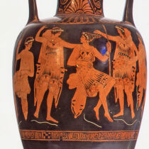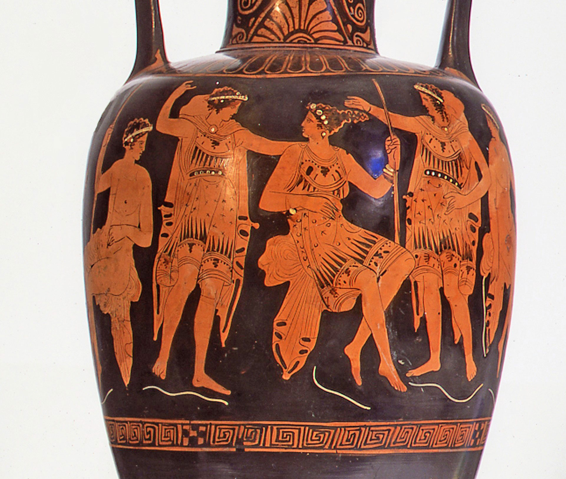 Η επόμενη στάση είναι στη Συλλογή των Αγγείων, που παρουσιάζεται στον πρώτο όροφο του Εθνικού Αρχαιολογικού Μουσείου. Εκεί, η Μ. Λαγογιάννη θα επιλέξει ένα διαφορετικό γυναικείο πρότυπο: «Στην αίθουσα 56 (προθήκη 124) (εικ. 4) εκτίθεται ένας αττικός ερυθρόμορφος αμφορέας (Του Ζωγράφου του Μελεάγρου) που χρονολογείται γύρω στο 400-380 π.Χ. Στη γραπτή παράσταση στο κέντρο της κύριας όψης κυριαρχεί ανάμεσα σε τέσσερις ανδρικές μορφές η μορφή μιας γυναίκας που κρατά δόρυ. Πρόκειται για την Αταλάντη, τη μυθική ηρωίδα που συμμετείχε στο κυνήγι του Καλυδώνιου Κάπρου και στην περιπέτεια της Αργοναυτικής εκστρατείας. Αντιστοιχίες του μυθικού προτύπου της ηρωικής γυναίκας τεκμηριώνονται με βεβαιότητα σε διάφορες παραλλαγές στους ιστορικούς χρόνους. Ενδεικτικά μόνο, σας θυμίζω την Τελέσιλλα, τη λυρική ποιήτρια που έζησε στο Άργος κατά το πρώτο μισό του 5ου αι. π.Χ. Το 494 π.Χ. όταν ο Κλεομένης ο Λακεδαιμόνιος επιχείρησε να καταλάβει το Άργος, εκείνη ήταν που όπλισε τις γυναίκες του Άργους για να σώσουν την πόλη τους. Το συγκλονιστικό κατόρθωμα αφηγείται ο περιηγητής Παυσανίας (2.20.8-10), ο οποίος κατά την επίσκεψή του στο Άργος τον 2ο αι. μ.Χ. διαπίστωσε την ύπαρξη τιμητικής στήλης με ανάγλυφη παράσταση της Τελέσιλλας τη στιγμή που ετοιμάζεται να φορέσει το πολεμικό κράνος και ενώ έχει ρίξει τα βιβλία σκόρπια στα πόδια της».