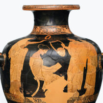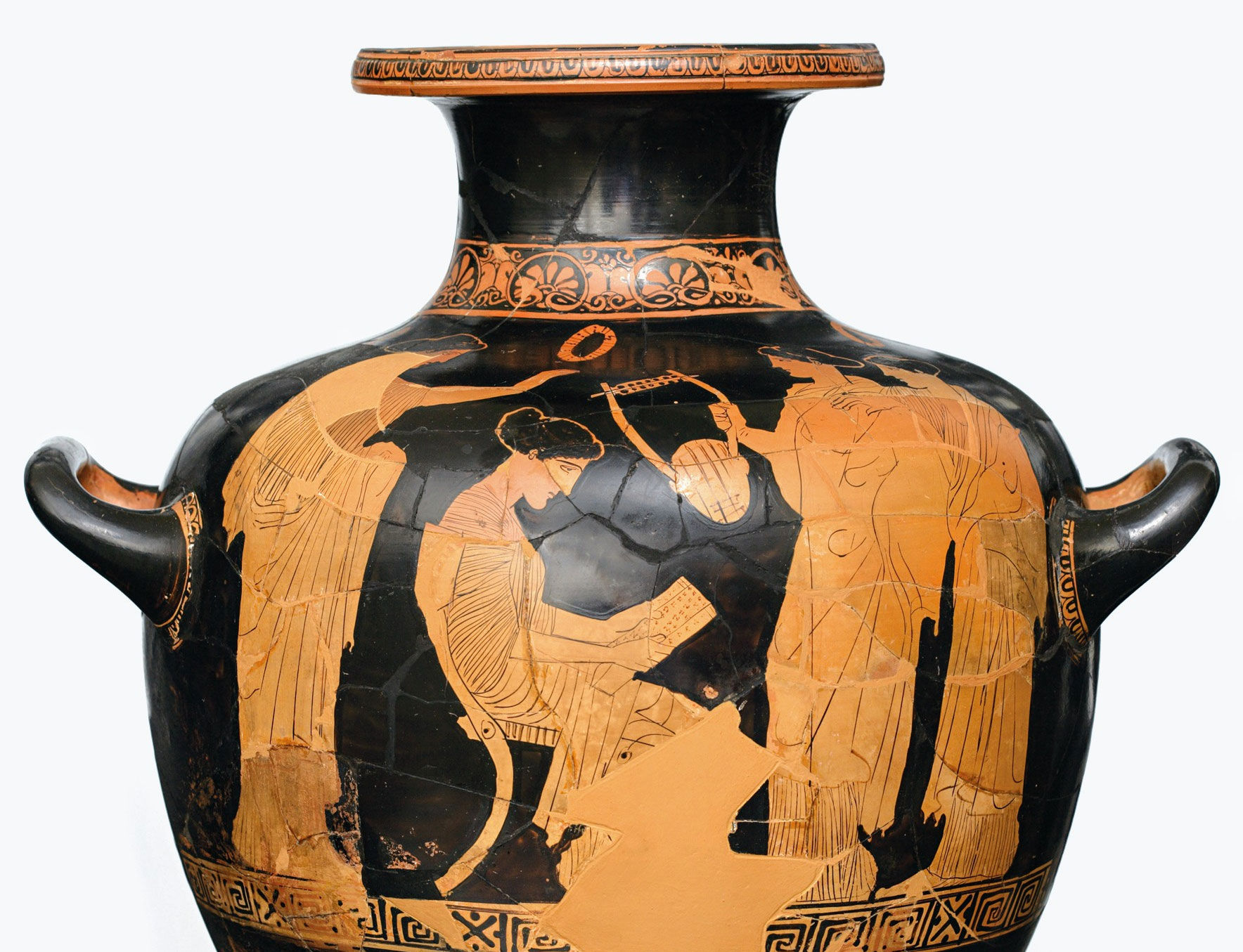 Μια ερυθρόμορφη υδρία (Της Ομάδας του Πολυγνώτου), που προβάλλει το πρότυπο της λόγιας γυναίκας, κλείνει τη σύντομη περιήγησή μας. «Προέρχεται από τη Βάρη της Αττικής και χρονολογείται γύρω στο 440-430 π.Χ. (αίθουσα 55, προθήκη 117) (εικ. 5). Στην παράσταση της κύριας όψης εικονίζεται η Σαπφώ, η μεγάλη λυρική ποιήτρια του 6ου αι. π.Χ. Καθισμένη σε κλισμό διαβάζει από τον κύλινδρο που κρατά στα χέρια της κάποιο ποίημα. Γύρω της εικονίζονται τρεις μαθήτριες. Η Καλλίς της προτείνει τη λύρα και η Νικόπολις τη στεφανώνει. Η γραπτή παράδοση αναφέρει ότι ο Πλάτων αποκαλούσε τη Σαπφώ σοφή και την είχε προσθέσει στην ομάδα των εννέα μουσών ως δέκατη μούσα. Η αποθέωση αυτή οπτικοποιείται και στην αττική υδρία του Εθνικού Αρχαιολογικού Μουσείου με την προσθήκη της λύρας και τη στεφάνωση της μεγάλης ποιήτριας», επισημαίνει η Μ. Λαγογιάννη. Και καταλήγει ως προς το μήνυμα της αρχαίας παράστασης: