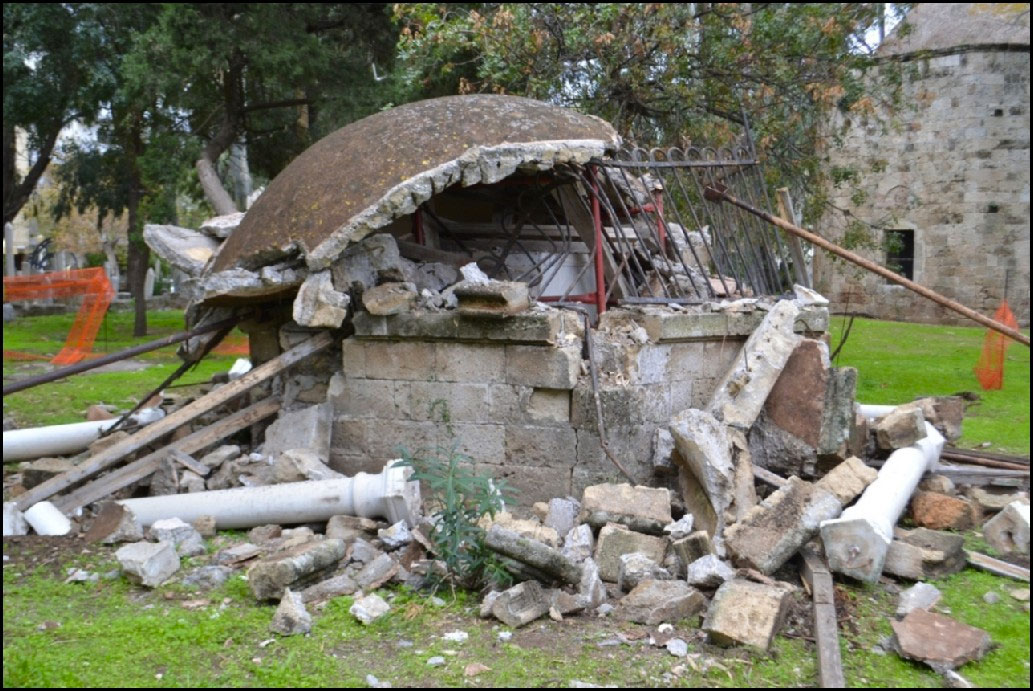 Το μαυσωλείο Μεχμέτ Σεκίμπ Πασά κατέρρευσε το 2013 από έντονα καιρικά φαινόμενα, όμως τα αίτια της κατάρρευσης εντοπίζονται στην κατασκευή του μνημείου και στην κακή κατάσταση στην οποία είχε περιέλθει λόγω γήρανσης και αστοχίας των υλικών. Σύμφωνα με την επιγραφή στον τάφο, ο Μεχμέτ Σεκίμπ απεβίωσε το 1894. Ωστόσο, το μαυσωλείο με τη σημερινή του μορφή κατασκευάστηκε μετά το 1927 επί ιταλοκρατίας, την περίοδο διοίκησης του Mario Lago. Στόχος των εργασιών είναι η αποκατάσταση της μορφής του ταφικού μνημείου, όπως αποδόθηκε επί ιταλοκρατίας, με προσπάθεια ένταξης και επανάχρησης όσων αρχιτεκτονικών μελών επιτρέψει η κατάσταση διατήρησής τους, μετά τη συντήρηση και την επισκευή τους.