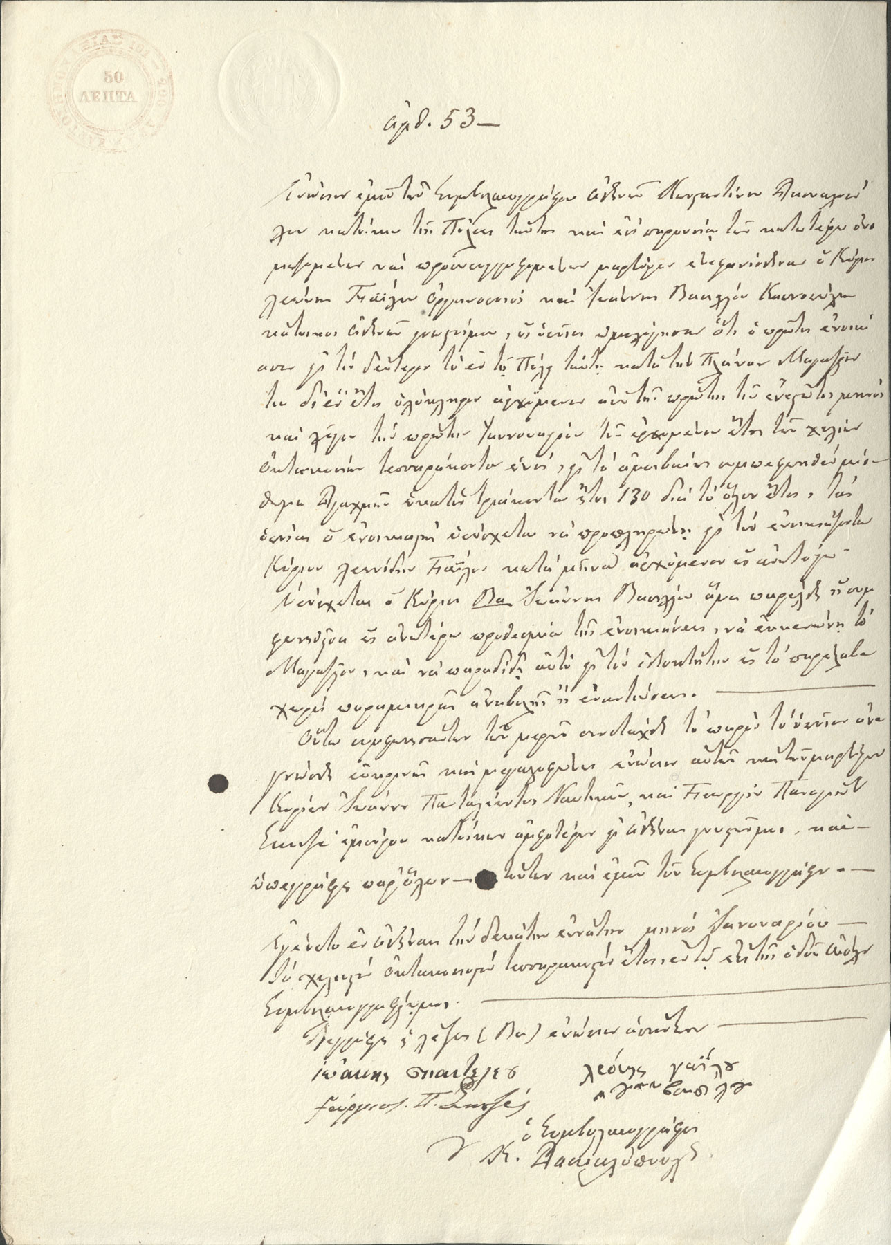 «Ἐνώπιον ἐμοῦ τοῦ συμβολαιογράφου Ἀθηνῶν κυρίου Κωνσταντίνου Δασκαλοπούλου κατοίκου τῆς πόλης ταύτης, καὶ ἐπὶ παρουσία τῶν κατωτέρω ὀνομαζομένων καὶ προεγγεγραμμένων μαρτύρων ἐνεφανίσθη ὁ κύριος Λεώνης Γκαΐλου ὀργανοποιὸς καὶ ὁ Ἰωάννης Βασιλείου Καπνοπώλης κάτοικοι Ἀθηνῶν, γνωστοί μου, οἱ ὁποῖοι ὁμολόγησαν ὅτι ὁ πρῶτος ἐνοικίασε στὸν δεύτερο τὸ ἐν τῇ πόλῃ ταύτην κατὰ τὴν Πλάκα μαγαζάκι του διὰ ἕν ἔτος ὁλόκληρο ἀρχόμενου ἀπὸ τῆς πρώτης τοῦ ἐνεστῶτος μηνὸς καὶ λήγειν τὴν πρώτη Ἰανουαρίου τοῦ ἐρχομένου ἔτους τῶν χιλίων οκτακοσίων τεσσαρακοστοῦ ἑνὸς εἰς τὸ ἀμοιβαίως συμφωνηθὲν ποσὸν τῶν ἑκατὸν τριάντα δραχμῶν ἤτοι 130 διὰ τὸ ὅλο ἔτος τὰς ὁποίας ὁ ἐνοικιαστὴς ὑπόσχεται νὰ προπληρώνει εἰς τὸν ἐνοικιάζοντα κύριον Λεωνίδα Γκαΐλον. Ὁ κος Ἰωάννης Βασιλείου ἅμα παρέλθει ἡ συμφωνηθεῖσα ὡς ἀνωτέρω προθεσμίαν τῆς ἐνοικιάσεως, νὰ ἐκκενώσει τὸ μαγαζίον καὶ νὰ παραδώσει αὐτὸ εἰς τὸν ἰδιοκτήτην του ὡς τὸ παρέλαβεν χωρὶς παραμικρᾶς ἀναβολῆς ἢ ἐναντιώσεως. Οὕτω συμφωνηθέντων τῶν μερῶν συντάχθη τὸ παρὸν τὸ ὁποῖο ἀναγνώσθη εὐκρινῶς καὶ μεγαλοφώνως ἐνώπιον αὐτῶν καὶ τῶν μαρτύρων κυρίου Πανταλέοντος Νικολάου ναυτικοῦ, καὶ Γεωργίου Παναγιώτου Σκουζὲ κατοίκων ἀμφοτέρων εἰς Ἀθήνας γνωστῶν μου καὶ ὑπεγράφη παρ’ όλων τούτων καὶ ἐμοῦ του συμβολαιογράφου».