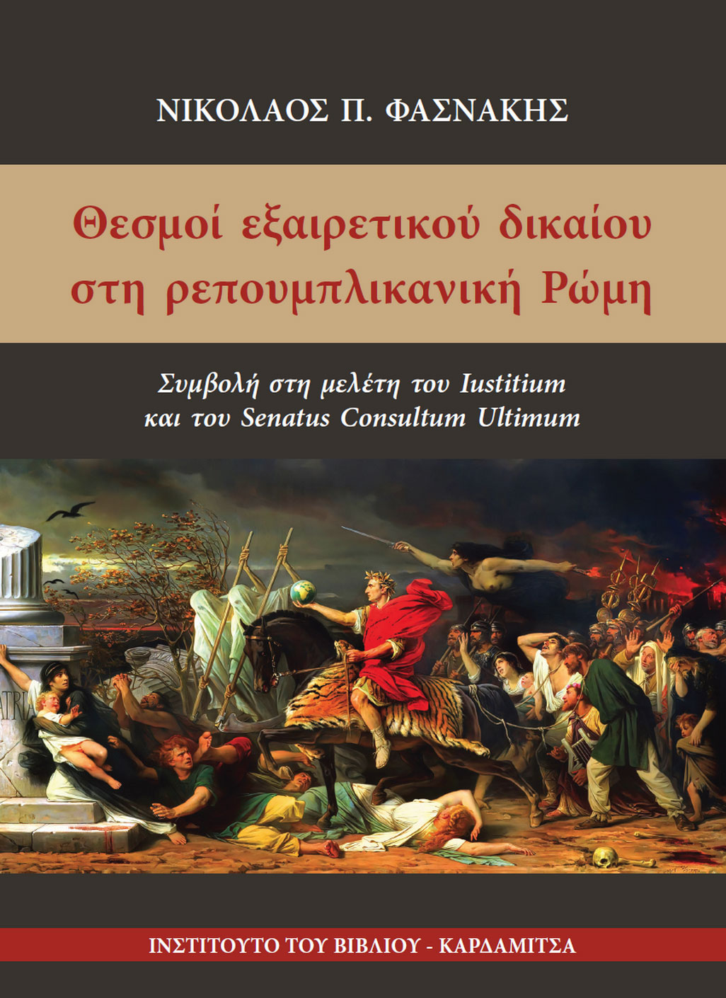 Νικόλαος Π. Φασνάκης, Θεσμοί εξαιρετικού δικαίου στη ρεπουμπλικανική Ρώμη. Συμβολή στη μελέτη του Iustitium και του Senatus Consultum Ultimum, Ινστιτούτο του Βιβλίου – Καρδαμίτσα, Αθήνα 2024, 424 σελ. ISBN: 978-960-354-581-1