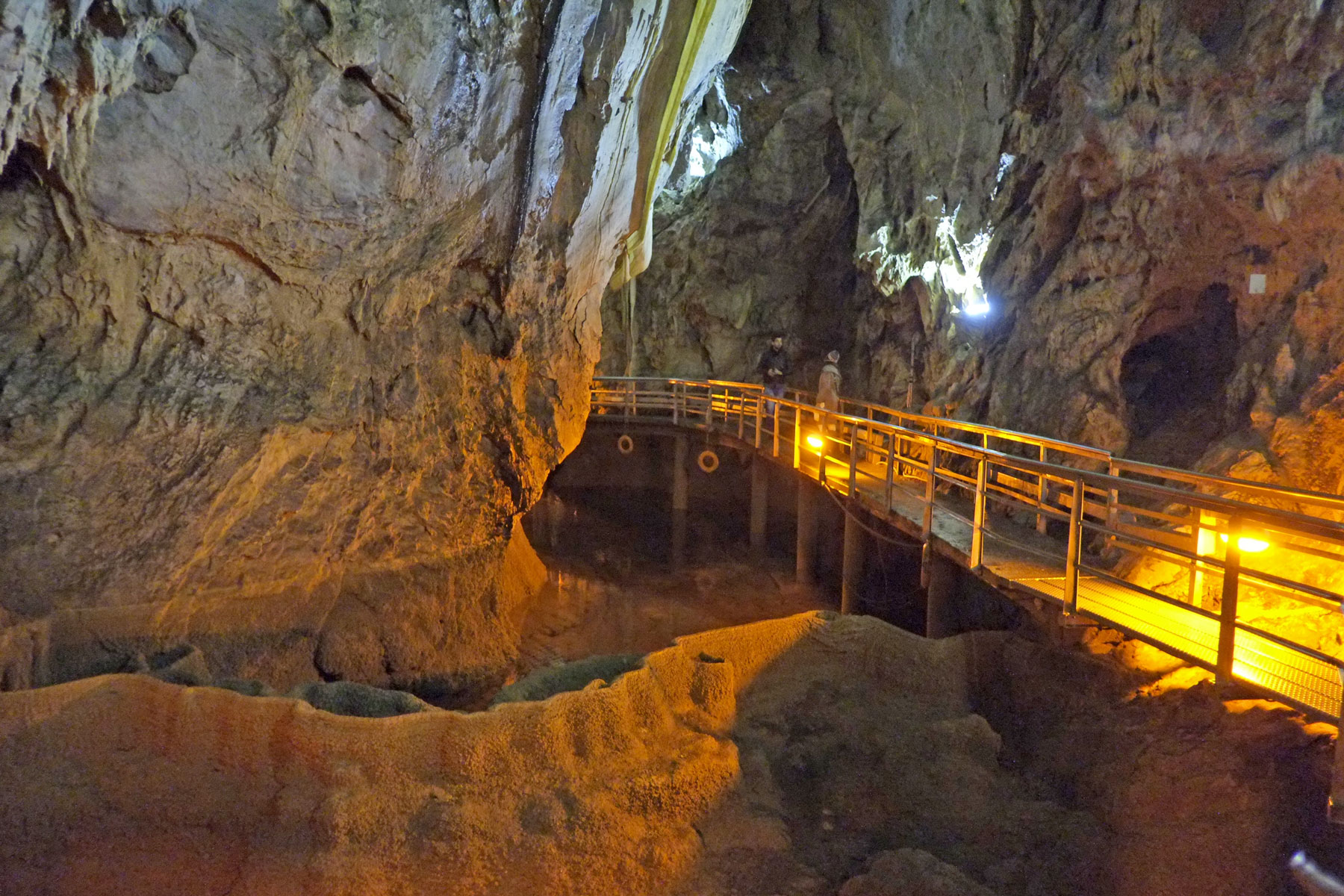 Το ορεινό ανάγλυφό του δεν προμηνύει σε καμία περίπτωση ότι μέσα σε αυτό μπορούσε κανείς να συναντήσει 13 μικρές ή μεγάλες λίμνες . Στην τεχνητή του είσοδο με έναν μακρύ διάδρομο που διακόπτεται από δύο πόρτες για τη καλύτερη προστασία του μικροκλίματος έχουν τοποθετηθεί στα δεξιά φωτογραφίες που απεικονίζουν σπηλαιολόγους και γεωλόγους μέσα σε βάρκες προσπαθώντας να διασχίσουν τις λίμνες που υπάρχουν μέσα σε αυτό.