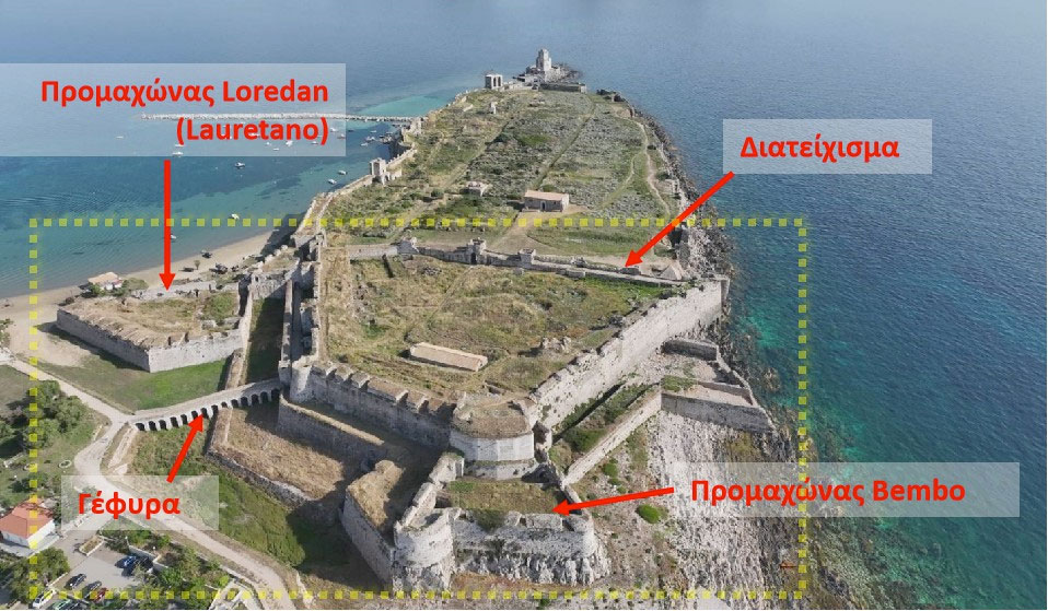 Το αντικείμενο του ερευνητικού προγράμματος επιμερίστηκε στις ακόλουθες ενότητες: Βόρειο και ανατολικό τείχος, προτείχισμα, οχυρωματικός περίβολος χερσαίας πύλης, διατείχισμα, δυτικό τείχος, προμαχώνας Βembo, προμαχώνας Loredan, δυτικός προμαχώνας, τάφρος, βορειοδυτικό οχυρό. Για κάθε ενότητα συλλέχθηκαν ιστορικά τεκμήρια, καταγράφηκε η παθολογία και έγιναν προτάσεις για την αποκατάσταση των επιμέρους αρχιτεκτονικών και δομικών στοιχείων. Τα κύρια προβλήματα που αντιμετωπίζει το φρουριακό συγκρότημα είναι ρηγματώσεις, αποδιοργάνωση της δομής των τειχών και εκτεταμένες καταρρεύσεις στα σημεία όπου υπάρχει άμεση επαφή με τη θάλασσα. Επιπλέον εμφανίζει τοπικά προβλήματα στη δομή των τειχών, που οφείλονται στην απόσπαση υλικού κατά τους νεότερους χρόνους, με αποτέλεσμα την πρόκληση δομικών βλαβών αλλά και τη μορφολογική αλλοίωση του μνημείου, φθορά των ευπαθών δομικών υλικών, που οφείλεται στην υγρασία, ζητήματα κυκλοφορίας και ασφάλειας των επισκεπτών, ιδίως στο δυτικό τείχος.