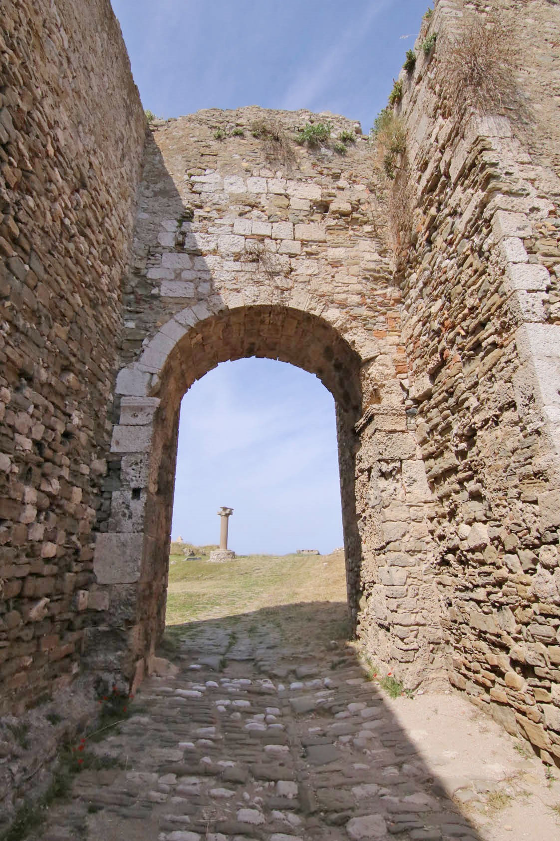 Το Κάστρο Μεθώνης, έκτασης 93 στρεμμάτων, καταλαμβάνει μια μακρόστενη λωρίδα γης, που εισχωρεί περίπου 400 μ. μέσα στη θάλασσα και επικοινωνεί με την ενδοχώρα μόνο από τη βόρεια πλευρά του. Η καστροπολιτεία αποτελείται από δύο τμήματα. Στα νότια απλώνεται η πόλη, που περικλείεται από απλό τείχος με πύργους σε τακτά διαστήματα. Στο νοτιότερο άκρο του κάστρου ανοίγεται η πύλη της Θάλασσας, η οποία μέσω λιθόκτιστης γέφυρας οδηγεί στο Μπούρτζι, το επιθαλάσσιο οχυρό. Στο βόρειο τμήμα προς την ενδοχώρα, που είναι το πλέον ευπρόσβλητο, αναπτύσσεται η Ακρόπολη, γνωστή στην Οθωμανική περίοδο ως Ιτς Καλέ (εσωτερικό κάστρο). Μπροστά στην Πύλη της Ακρόπολης διαμορφωνόταν η «Πλατεία των Όπλων», όπου συγκεντρώνονταν η εμπορική και κοινωνική ζωή της Μεθώνης. Περιβάλλεται στα βόρεια, στα ανατολικά και στα δυτικά από τείχη, τμήματα των οποίων χρονολογούνται στην Πρώιμη και Μέση Βυζαντινή περίοδο καθώς και στην Πρώιμη Ενετική περίοδο, κατά τον 15ο αιώνα, πριν από την εισαγωγή και ανάπτυξη του πυροβολικού και του προμαχωνικού συστήματος. Τα δύο τμήματα χωρίζονται με ένα ενδιάμεσο χαμηλό τείχος ενισχυμένο με πύργους, εξ ολοκλήρου κατασκευασμένο κατά την πρώτη Οθωμανική περίοδο. Η κύρια πύλη του κάστρου κτίστηκε από τους Ενετούς. Η πρόσβαση στο εσωτερικό του φρουρίου γίνεται μέσω γέφυρας, των αρχών του 19ου αιώνα. Ο διάδρομος οδηγεί σε έναν οχυρωματικό περίβολο, διαμορφωμένο για την προστασία της χερσαίας πύλης της πόλης, η οποία ανήκει στις μεσαιωνικές οχυρώσεις των Βενετών κατά τον 15ο αιώνα. Η αμυντική θωράκιση της εισόδου διασφαλίζεται από τον προμαχώνα Bembo (β’ μισό 15ου αι.) στα δυτικά και τον προμαχώνα Loredan (1714) στα ανατολικά. Τα τείχη έχουν δεχθεί επεμβάσεις κατά την Οθωμανική περίοδο.