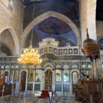 Εκτός από τον πλούσιο γλυπτό διάκοσμο του ναού της Παναγίας, ο οποίος έχει μελετηθεί και παρουσιαστεί από τους ερευνητές, υπάρχει ένα αρχαίο έργο τέχνης που έχει κάπως παραμεληθεί. Πρόκειται για εντοιχισμένη ταφική στήλη από γαλαζωπό μάρμαρο με ανάγλυφη παράσταση στο πάνω μέρος της (ύψος 0,40 μ., πλάτος 0,48 μ.), η οποία βρίσκεται στο εσωτερικό τμήμα του αριστερού πυλώνα της αψίδας του νάρθηκα, ο οποίος οδηγεί στον κυρίως ναό της Παναγίας (εικ. 1, 2).