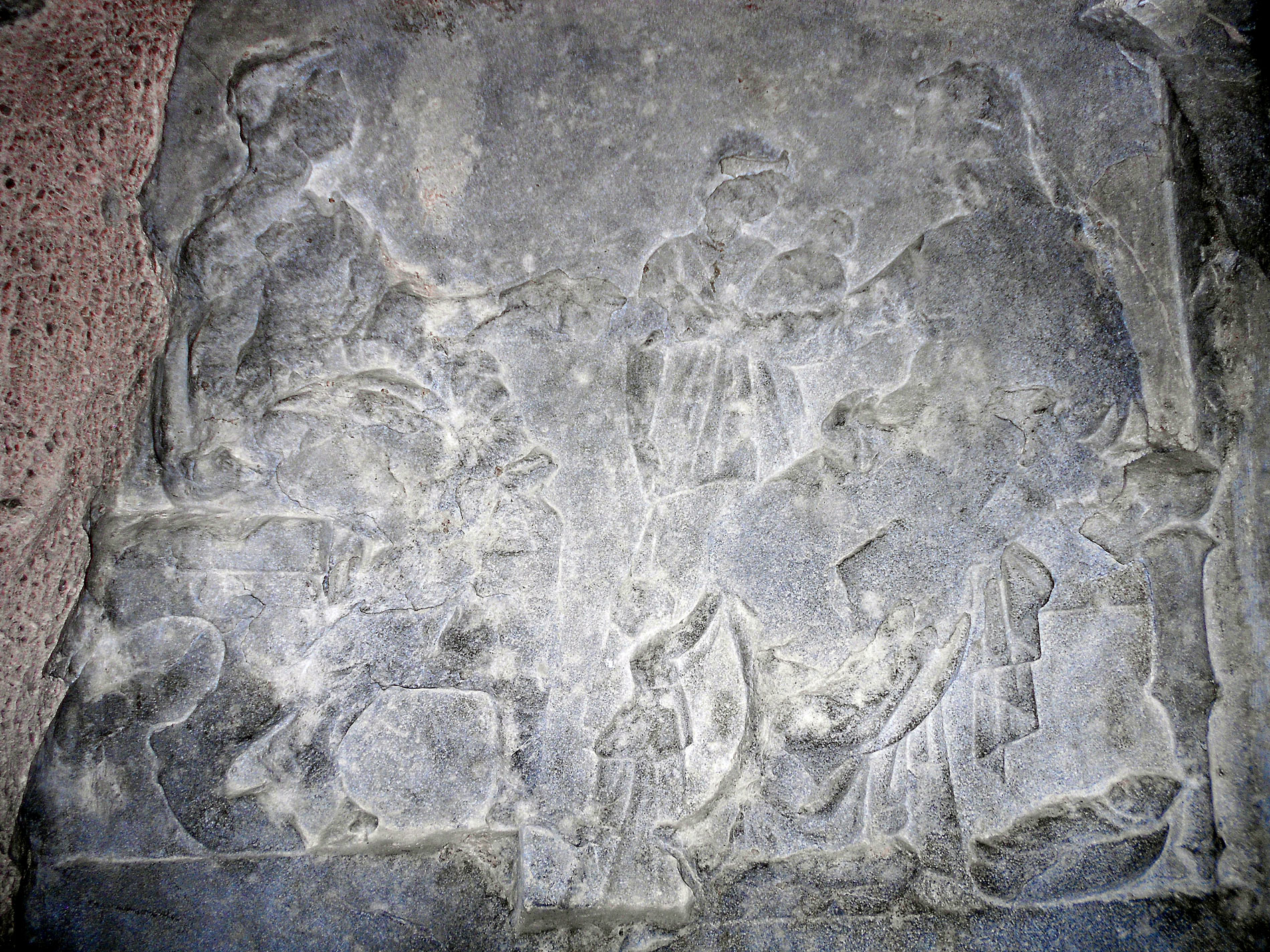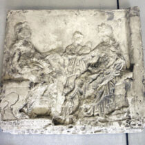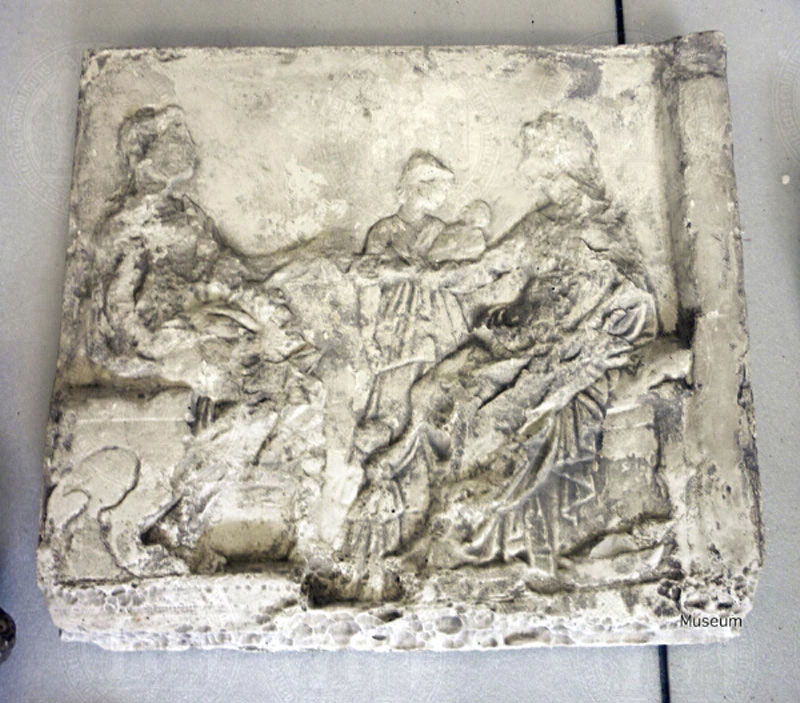 Στo Annali dell’Instituto di Corrispondenza Archeologica του Αρχαιολογικού Ινστιτούτου Ρώμης παρουσιάστηκε, το 1861, μια πρώτη περιληπτική περιγραφή του αναγλύφου [σημ. 3], και το 1885 οι K. Friederichs και P. Wolters πρόσφεραν ορισμένα νέα στοιχεία [σημ. 4]. Πολύ αργότερα, το 2010, η Livia Bevilacqua παρουσίασε το ανάγλυφο εν συντομία σημειώνοντας [σημ. 5] ότι η ταφική στήλη τοποθετήθηκε στο συγκεκριμένο σημείο όρθια σε β’ χρήση κατά την ανέγερση της εκκλησίας τον 9ο αιώνα (874).