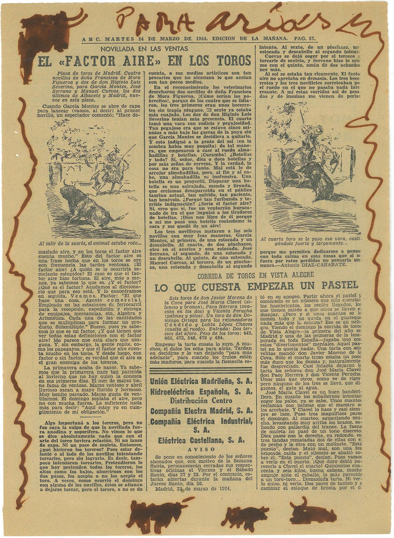 Πρόκειται για περισσότερα από 60 φύλλα, απόδειξη της φιλικής αλληλογραφίας μεταξύ δύο οπαδών της ταυρομαχίας, που έλαβε χώρα μεταξύ 1962 και 1968. Περιλαμβάνουν από σημάδια και υπογραμμίσεις για την ανάδειξη ενός άρθρου έως μικρά σχέδια ταύρων, ταυρομάχων, πικαδόρων ή άλλες σκηνές της αρένας, δημιουργώντας ένα είδος καλλιτεχνικής χειρονομίας βασισμένης στον απόλυτο αυθορμητισμό.