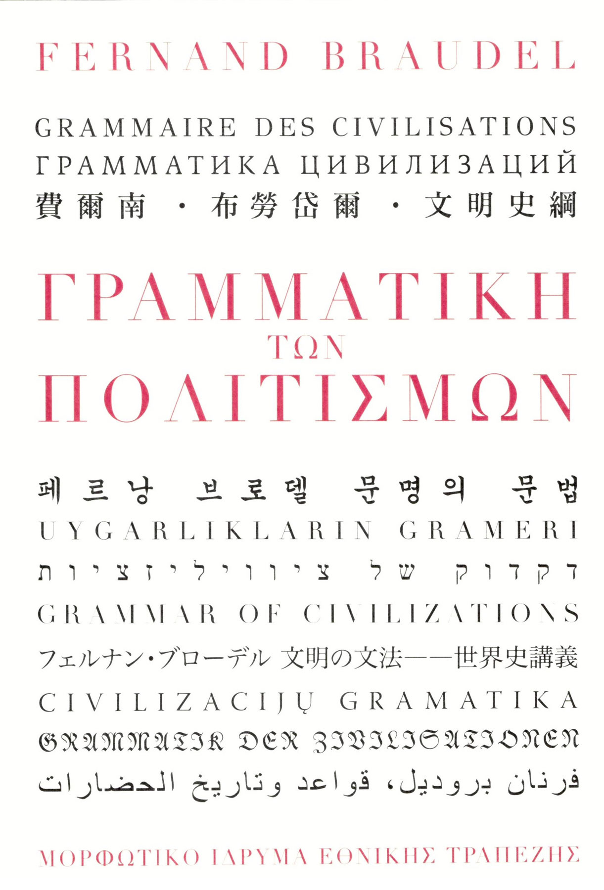 Fernand Braudel, Γραμματική των πολιτισμών, μτφρ.: Άρης Αλεξάκης, Μορφωτικό Ίδρυμα Εθνικής Τραπέζης, Αθήνα 2024 (11η ανατύπωση), 784 σελ. ISBN: 978-960-250-219-8