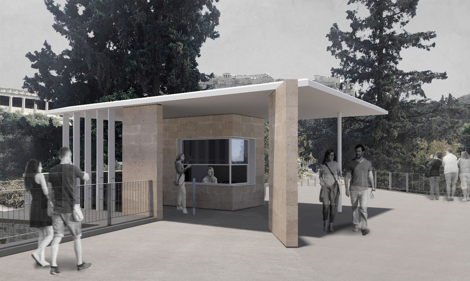 Όσον αφορά στις εισόδους-εκδοτήρια, προβλέπεται η αντικατάσταση του υπάρχοντος κτηρίου εκδοτηρίων, στην κύρια είσοδο επί της οδού Αδριανού, με νέο το οποίο να ανταποκρίνεται στις σύγχρονες ανάγκες. Θα οργανώνει τον χώρο αναμονής και τις πορείες εισόδου-εξόδου, και θα παρέχει σκίαση σε επισκέπτες και εργαζομένους. Για την ανάδειξη του αρχαιολογικού χώρου και την καλύτερη οργάνωση του χώρου εισόδου προβλέπονται αφαιρέσεις τμημάτων της υφιστάμενης πλατφόρμας εισόδου και πλήρωση σε ορισμένα άλλα. Στις εισόδους επί των οδών Αστεροσκοπείου και Αποστόλου Παύλου προγραμματίζεται η αποκατάσταση των υφιστάμενων εκδοτηρίων και η αισθητική αναβάθμισή τους.
