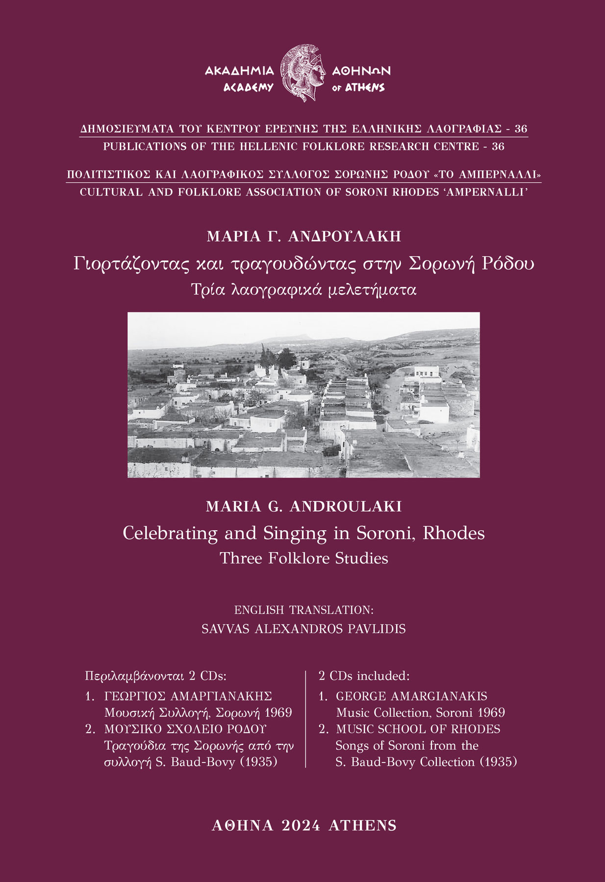 Μαρία Γ. Ανδρουλάκη, Γιορτάζοντας και τραγουδώντας στην Σορωνή Ρόδου. Τρία λαογραφικά μελετήματα / Celebrating and Singing in Soroni Rhodes. Three Folklore Studies (Δημοσιεύματα του Κέντρου Ερεύνης της Ελληνικής Λαογραφίας της Ακαδημίας Αθηνών, 36), επιστημονικός υπεύθυνος εκδοτικής σειράς: Ευάγγελος Καραμανές, Πολιτιστικός και Λαογραφικός Σύλλογος Σορωνής Ρόδου «Το Αμπερνάλλι», Αθήνα 2024 [στην ελληνική και αγγλική, μτφρ. Σάββα Αλέξανδρου Παυλίδη], 700 σελ. + 2 CDs. ISBN: 978-618-85132-4-2.