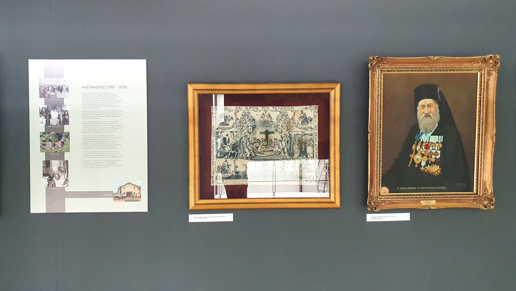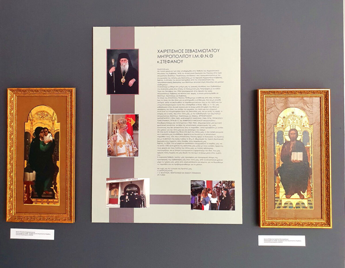 Ευρήματα από τον αρχαιολογικό χώρο των Φιλίππων εκτίθενται για πρώτη φορά μαζί με εκκλησιαστικά κειμήλια, θρησκευτικές εικόνες από το κειμηλιαρχείο της ΙΜΦΝΘ, άμφια και προσωπογραφίες των τριών πρώτων επισκόπων που ποίμαναν σε αυτά τα 100 χρόνια την Ιερά Μητρόπολη (Χρυσόστομος 1924-1967, Αλέξανδρος 1965-1974, Προκόπιος 1974-2017).