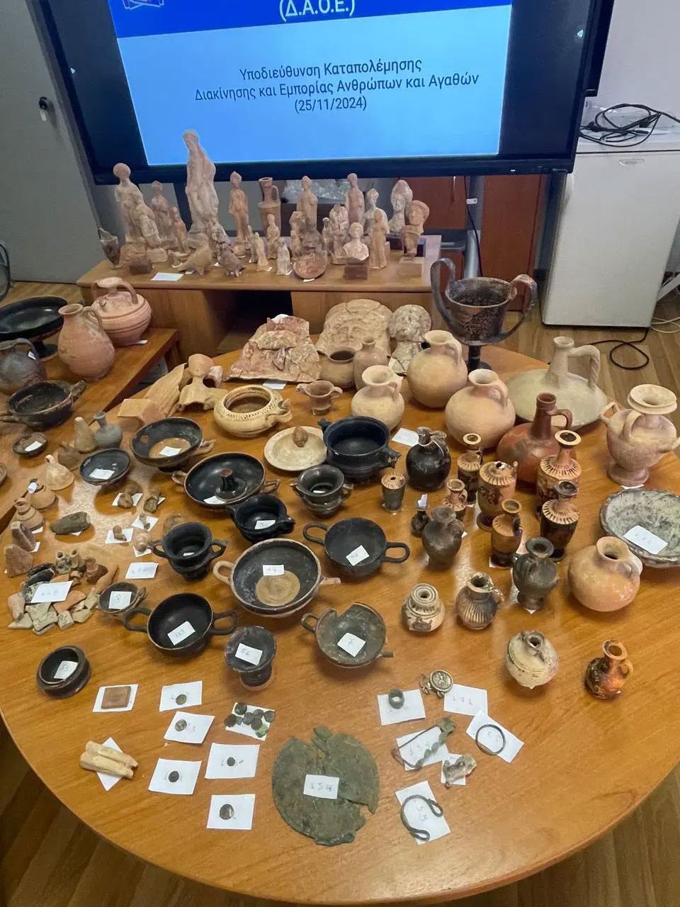 Ενδεικτικά, κατασχέθηκαν κύλικες, φιαλίδια, λήκυθοι, πήλινα ειδώλια και ομοιώματα, πρόχοι, μικρογραφικοί σκύφοι Αρχαϊκής και Κλασικής/Ελληνιστικής περιόδου, πήλινοι λύχνοι ρωμαϊκών/βυζαντινών χρόνων, χάλκινα και αργυρά νομίσματα, καθώς και θραύσματα κεραμικής.