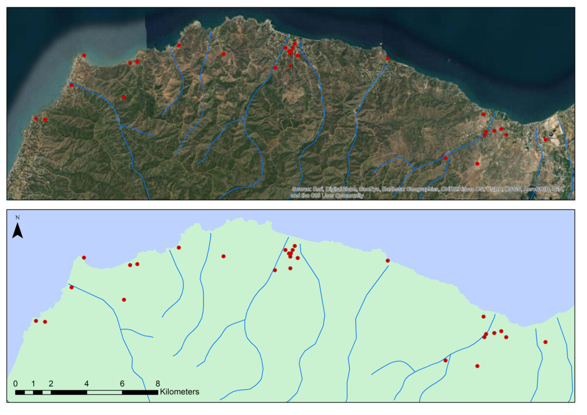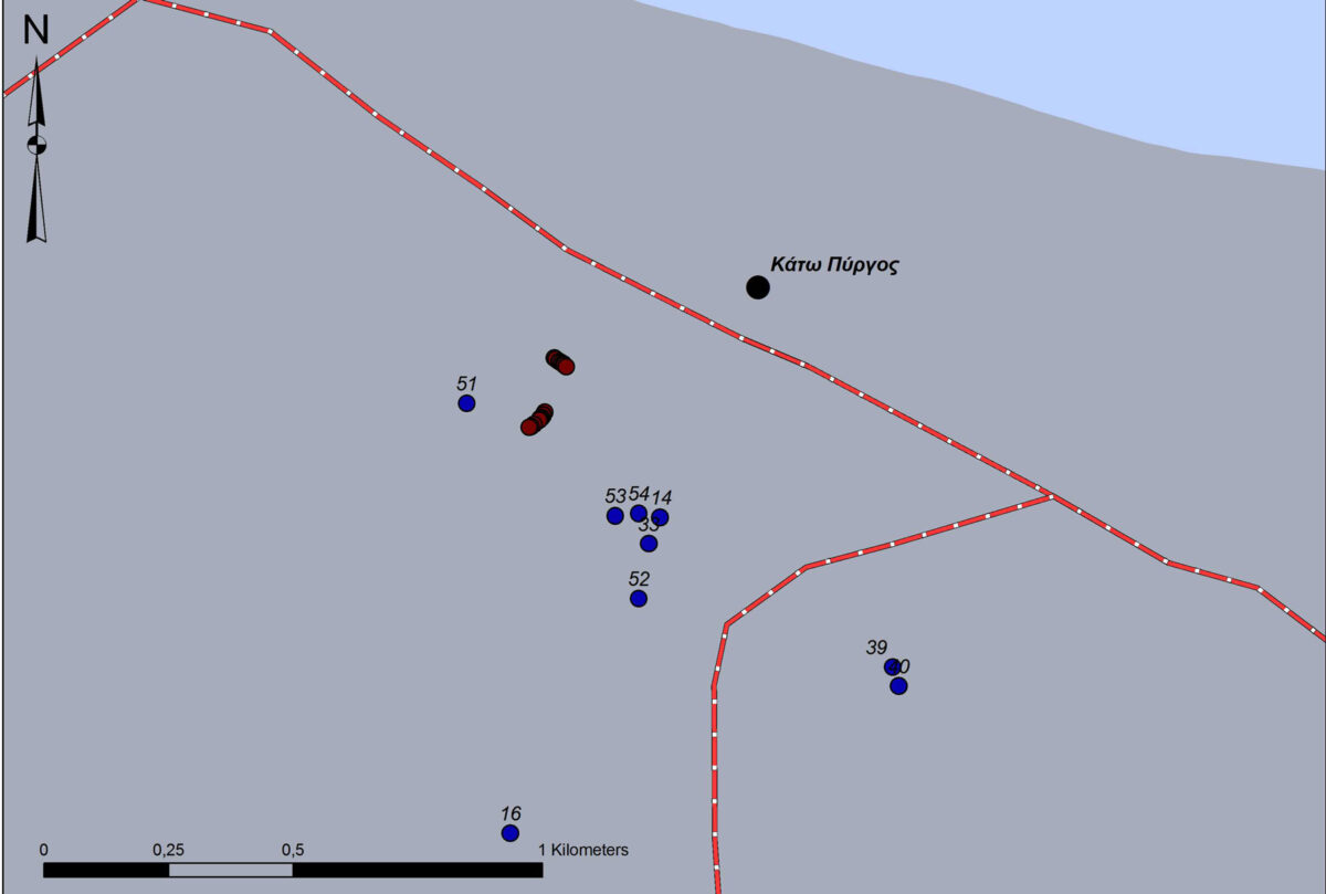 Οι θέσεις που εντοπίστηκαν και χαρτογραφήθηκαν, όπως προκύπτουν από το αρχειακό υλικό, αποτελούν στην πλειονότητά τους τυχαίες ανευρέσεις, κυρίως τάφων, διαφόρων χρονικών περιόδων, ενώ μεμονωμένα αναφέρονται και θέσεις κατοίκησης της Εποχής του Χαλκού, της Πρώιμης Βυζαντινής περιόδου κ.ά. [σημ. 20]. Στην περιοχή του Κάτω Πύργου (εικ. 8) καταγράφεται ο μεγαλύτερος αριθμός θέσεων, γεγονός που οφείλεται μάλλον στη μεγαλύτερη ανάπτυξη του χωριού σε σχέση με τα υπόλοιπα χωριά της Τηλλυρίας και τη συνακόλουθη δημιουργία έργων υποδομής, κατά τη διάρκεια των οποίων αποκαλύπτονται συνήθως οι αρχαιότητες.