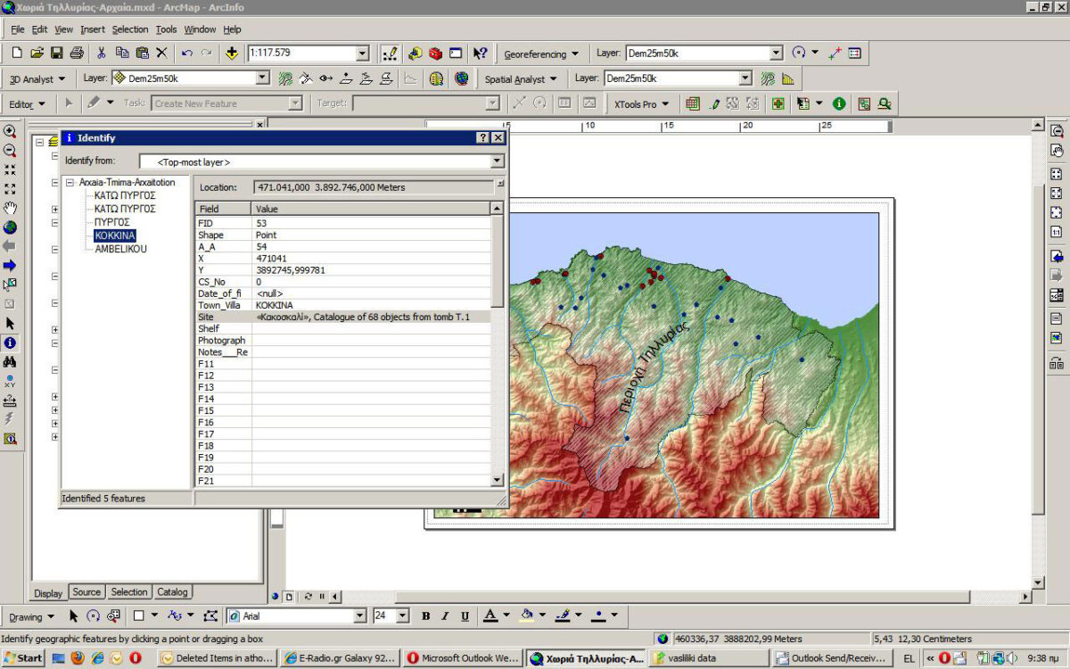 Το δεύτερο στάδιο της παρούσας εργασίας αφορούσε στην ψηφιοποίηση και τη χαρτογράφηση των δεδομένων που συλλέχθηκαν, και την εισαγωγή τους και περαιτέρω επεξεργασία σε Γεωγραφικό Σύστημα Πληροφοριών (Geographic Information Systems, εφεξής GIS). Το GIS αποτελεί εργαλείο το οποίο επιτρέπει την οργάνωση υπό μορφή βάσης δεδομένων του μεγάλου όγκου ψηφιακής πληροφορίας, σχετιζόμενης με τις αρχαιολογικές θέσεις υπό μελέτη, και συνακόλουθα επιτρέπει την ευκολότερη διαχείριση της πληροφορίας, τη γεωγραφική ανάλυση και την οπτικοποίηση [σημ. 14]. Παράλληλα, με τον τρόπο αυτό προστατεύεται και η πληροφορία του έντυπου αρχειακού υλικού, το οποίο με την πάροδο των χρόνων υπόκειται σε φυσικές φθορές.