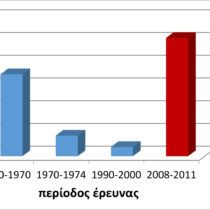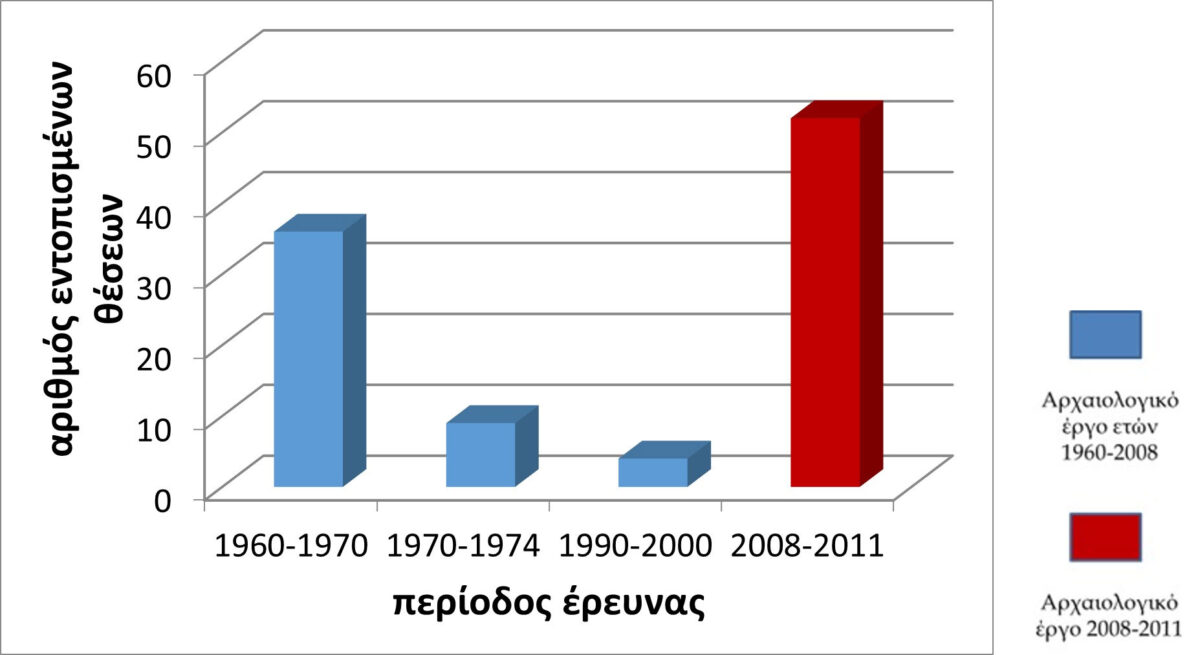 Από τον συνολικό αριθμό των περίπου 70 θέσεων [σημ. 15] που ανακτήθηκαν από το αρχειακό υλικό, παρατηρείται ότι οι καταχωρισμένες έρευνες που διεξήχθησαν στην περιοχή αριθμούν ελάχιστες περιπτώσεις κατά τη δεκαετία του 1940 και 1950, ενώ οι περισσότερες αριθμητικά πραγματοποιήθηκαν κατά τη δεκαετία του 1960 και στις αρχές της δεκαετίας του 1970, με σποραδικές εργασίες κατά τη δεκαετία του 1990 (εικ. 5). Όπως απορρέει από το αρχειακό υλικό, οι αρχαιολογικές έρευνες στην περιοχή τις περισσότερες φορές δεν έγιναν στο πλαίσιο στοχευμένης, προγραμματισμένης και συστηματικής δραστηριότητας, αλλά από ανάγκη, με αφορμή συνήθως τυχαίες ανευρέσεις αρχαιοτήτων κατά την πραγματοποίηση έργων υποδομής ή και καταγγελίες για πιθανές συλήσεις τάφων [σημ. 16], καθώς και άλλες περιπτώσεις. Ακολουθεί ένα χρονικό κενό σε σχέση με την αρχαιολογική έρευνα στην περιοχή, για να φτάσουμε στο έτος 2008 όπου το Μουσείο Κύκκου είχε αναλάβει διάφορα σχετικά προγράμματα. Συνοπτικά αναφέρονται η συστηματική ανασκαφή στη θέση «Αυλή» στο χωριό Πάνω Πύργος [σημ. 17], η πρώτη δηλαδή σύγχρονη ανασκαφή συστηματικού χαρακτήρα στην περιοχή, το πρόγραμμα εντοπισμού των αρχαίων νεκροπόλεων [σημ. 18] (εικ. 6), το πρόγραμμα καταγραφής των ερειπωμένων εκκλησιών και η μελέτη του μεσαιωνικού παρατηρητηρίου στον Κάτω Πύργο [σημ. 19] (εικ. 7).