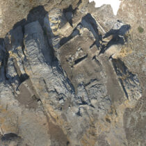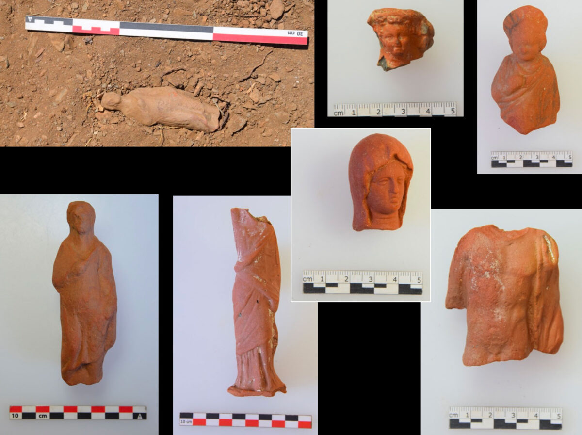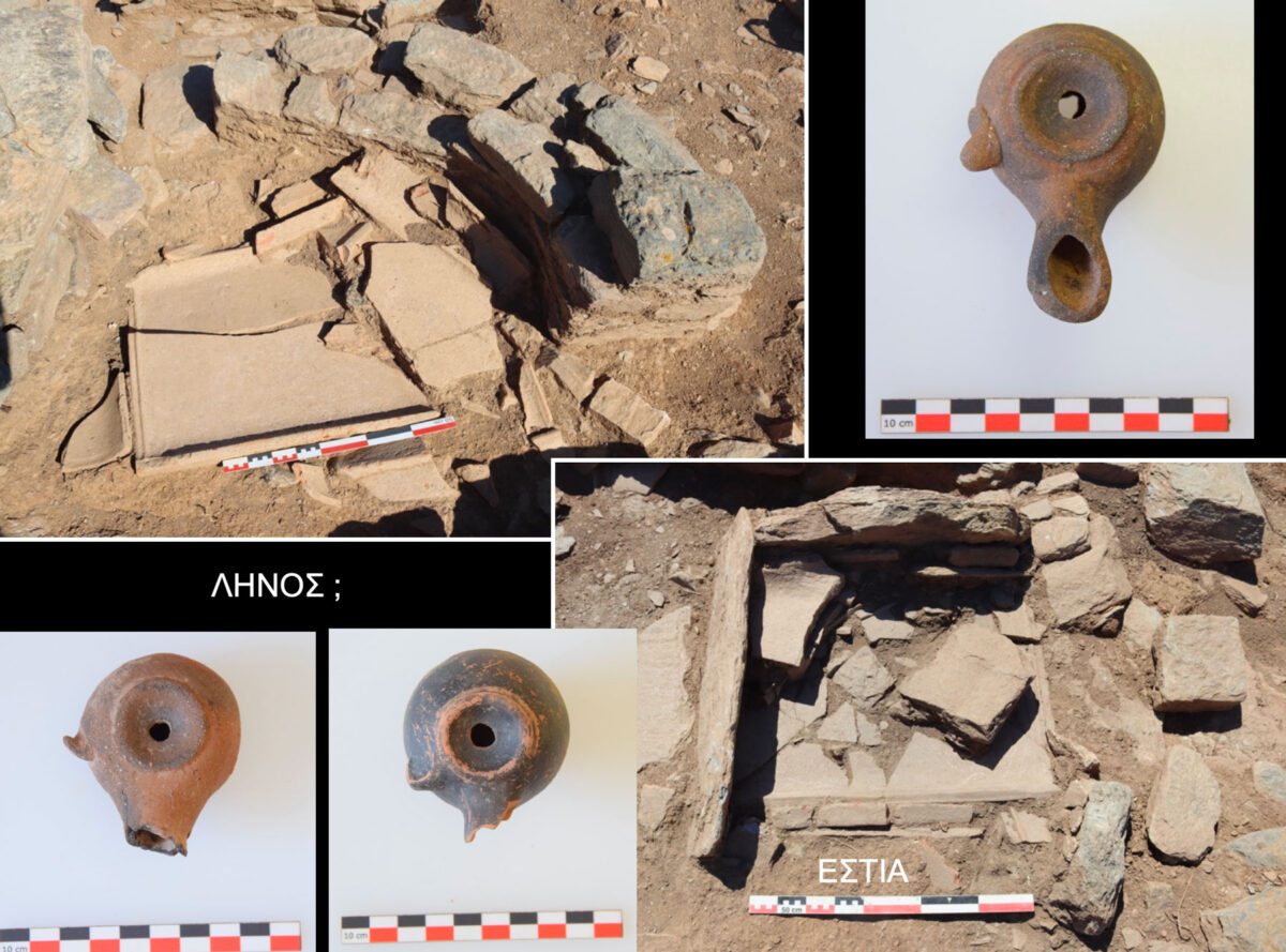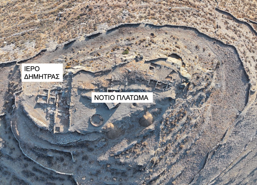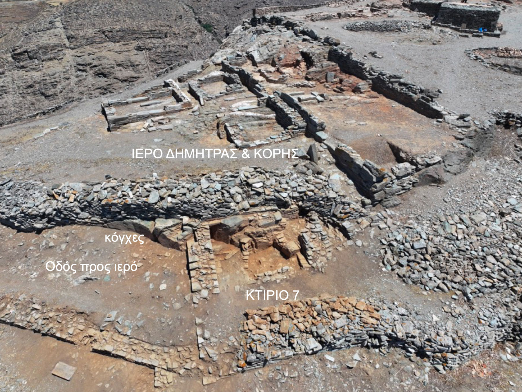 Tο βόρειο τμήμα του πλατώματος της ακρόπολης καταλαμβάνει ιερό, το οποίο ταυτίζεται με ιερό της Δήμητρας και της Κόρης, σημαντικό τμήμα του οποίου ανασκάφηκε τις περιόδους 2021-2023 (εικ. 2). Φέτος η έρευνα επικεντρώθηκε στο δυτικό τμήμα του ιερού με στόχο την κατανόηση της πρόσβασης σε αυτό (εικ. 2). Άρχισε να αποκαλύπτεται μια οδός πλάτους 4,50 μ. και αποκ. μήκους περ. 10 μ., η οποία καταλήγει προς τα νότια σε ένα σχεδόν τετράγωνο οικοδόμημα εξωτερικής πλευράς 5,50 μ., με πολύπλοκη εσωτερική διαρρύθμιση. Οι λαξεύσεις του φυσικού βράχου υποδηλώνουν κάποια διαμόρφωση με ξύλινες κλίμακες και δάπεδα που ωστόσο, στο παρόν στάδιο της έρευνας, δεν μπορούν να κατανοηθούν πλήρως. Ένας ακέραιος λυχνοστάτης βρέθηκε πεσμένος εντός του κτίσματος αυτού (εικ. 3). Κατά μήκος της «οδού» υπήρχαν κόγχες διαμορφωμένες στον φυσικό βράχο που πρέπει να φιλοξενούσαν ειδώλια, καθώς ορισμένα ακέραια βρέθηκαν πεσμένα κοντά σε αυτές (εικ. 4).