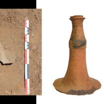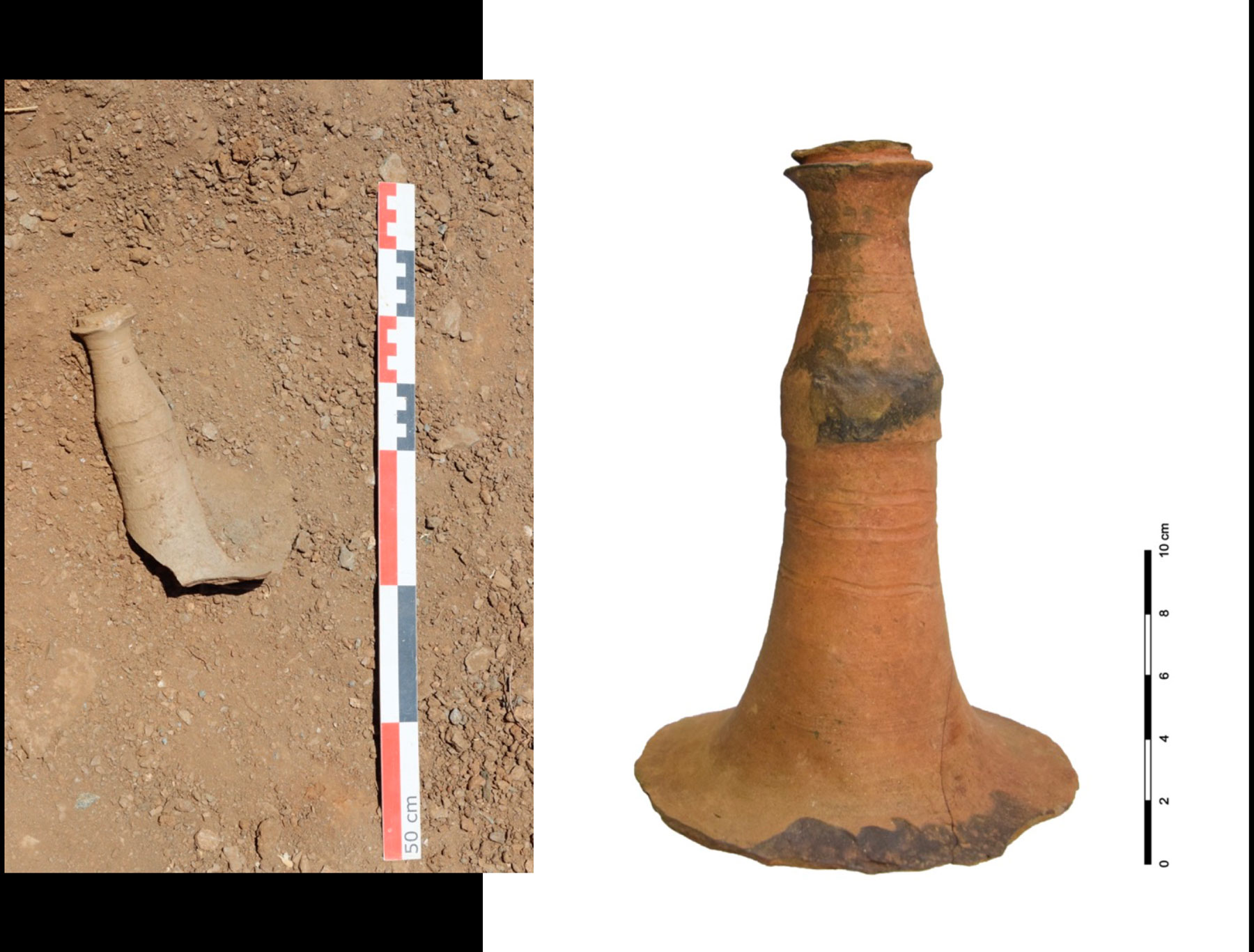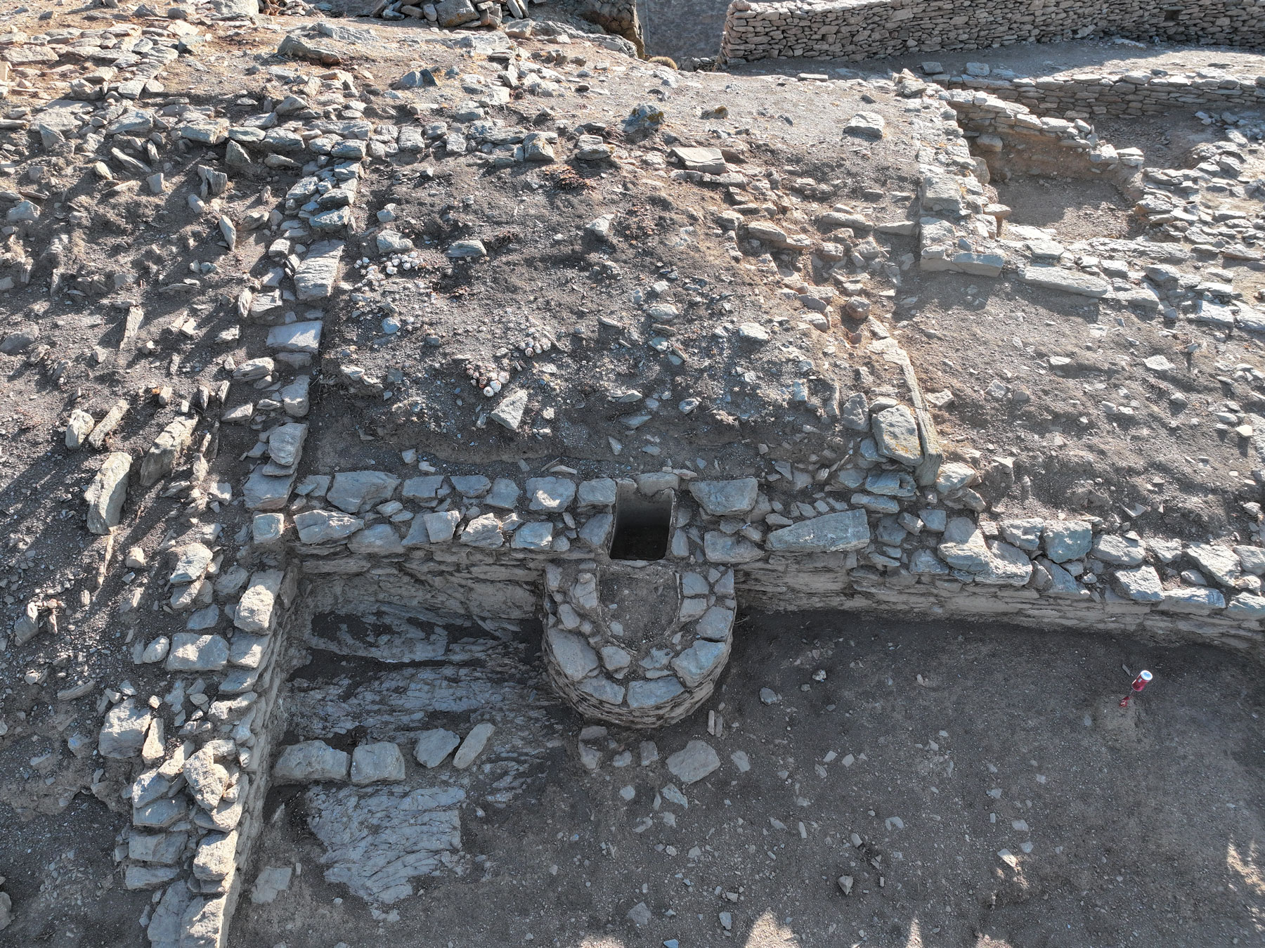 Βορειότερα πραγματοποιήθηκε τομή πλάτους 2 μ. στο Κτίριο 9 (διαστ. 4,80×4,60 μ.) (εικ. 12-13). Στη ΝΔ γωνία αποκαλύφθηκαν δύο ημικυκλικές λίθινες κατασκευές σε διαφορετικά επίπεδα που επικοινωνούν μεταξύ τους με αύλακες διαμορφωμένες στα τοιχώματά τους (ίσως ληνός;). Αμέσως βορειότερα αποκαλύφθηκε τετράγωνη εστία, πλευράς 0,75 μ., που σχηματίζεται από κεράμους και όρθια τοποθετημένες σχιστόπλακες στις δύο πλευρές. Η εστία αντιπροσωπεύει παλαιότερη φάση καθώς όχι μόνο βρίσκεται σε χαμηλότερο επίπεδο, αλλά το στρώμα με τα πυρακτωμένα χώματα και τη στάχτη που απλώνεται γύρω και πάνω από αυτήν αποτελεί την επίχωση πάνω στην οποία εδράζονται οι δύο ημικυκλικές κατασκευές. Από την αρχική αυτή φάση του χώρου προέρχονται αρκετοί λύχνοι ελληνιστικών χρόνων (εικ. 13) καθώς και χάλκινο νόμισμα Σμύρνης του τέλους 3ου – αρχών 2ου αι. π.Χ.