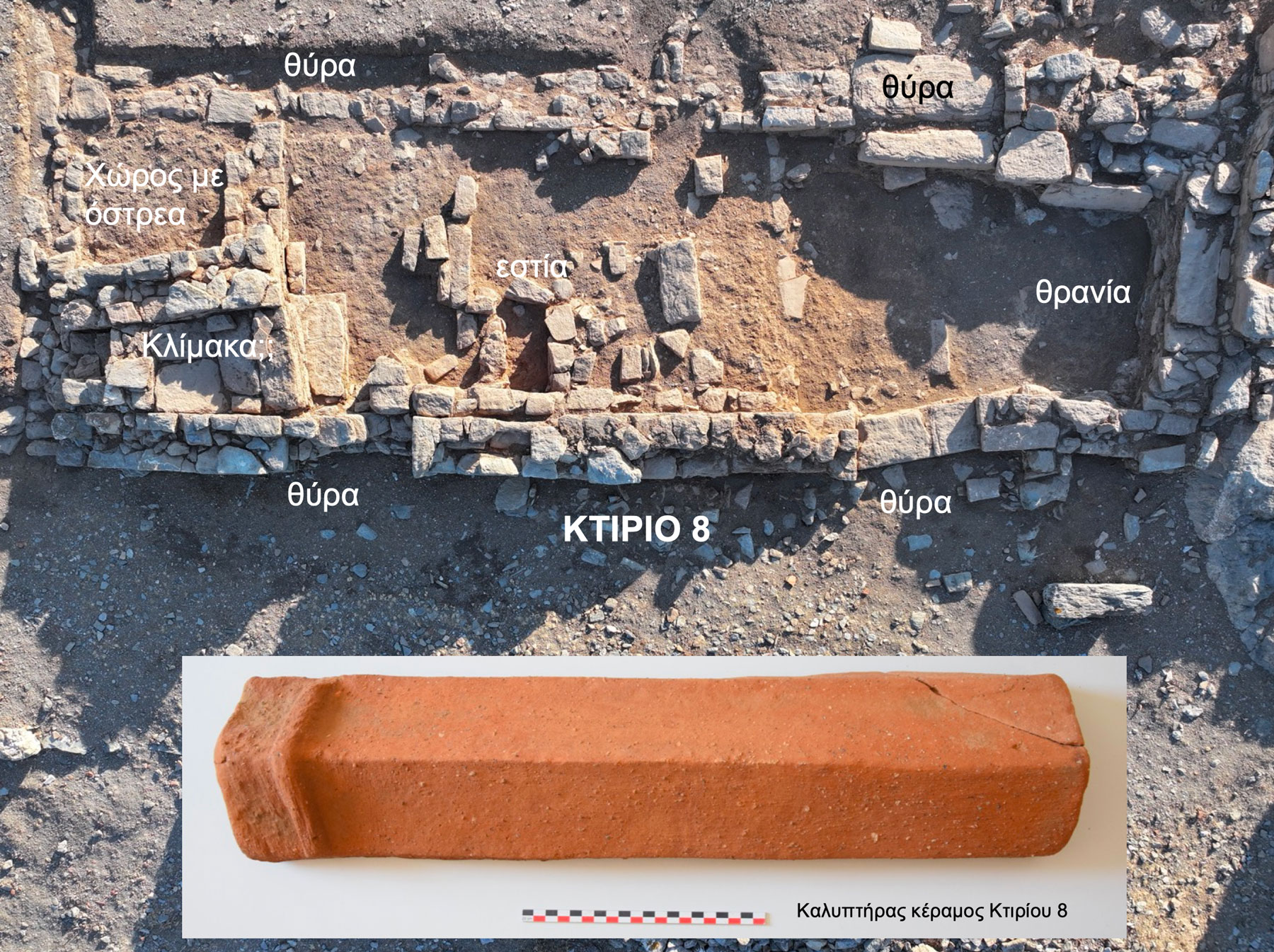 Το τελευταίο κτίριο που ερευνήθηκε φέτος (Κτίριο 8) καταλαμβάνει το βόρειο άκρο του πλατώματος (εικ. 14). Έχει συνολικό μήκος 11 μ. και πλάτος 3,60 μ. Τόσο στον ανατολικό όσο και στον δυτικό επιμήκη τοίχο υπάρχουν από δύο αντωπές θύρες. Συνεπώς έχουμε ένα οικοδόμημα που δίνει την εντύπωση ενός προπύλου. Στο νότιο τμήμα του κτιρίου, καθώς και στο μεσοδιάστημα ανάμεσα στις δυο θύρες του δυτικού τοίχου, αποκαλύφθηκε στενό λίθινο θρανίο. Σε επαφή με το τελευταίο, πλησιέστερα προς τη βόρεια θύρα, αποκαλύφθηκε ορθογώνια εστία που πλαισιώνεται από κατακόρυφα τοποθετημένους λίθους. Η περιοχή ήταν διάσπαρτη με στάχτες και πλήθος οστών ζώων, τα περισσότερα καμένα. Η διαμόρφωση του βορείου άκρου του οικοδομήματος δεν είναι ξεκάθαρη. Στη ΒΑ γωνία ο ορθογώνιος χώρος απέδωσε πληθώρα οστρέων, κυρίως πατελίδες. Στη ΒΔ γωνία υπάρχει τραπεζιόσχημη κτιστή κατασκευή που ίσως σχετίζεται με κάποιο κλιμακοστάσιο που οδηγούσε σε όροφο. Να σημειωθεί ότι το νότιο μισό του κτιρίου καλυπτόταν από εκτεταμένο στρώμα κεράμων κορινθιακού τύπου, σε αντίθεση με το κεντρικό και το βόρειο τμήμα όπου οι κέραμοι απουσίαζαν. Και αυτό το κτίριο παρουσιάζει διαφορετικές φάσεις χρήσης.