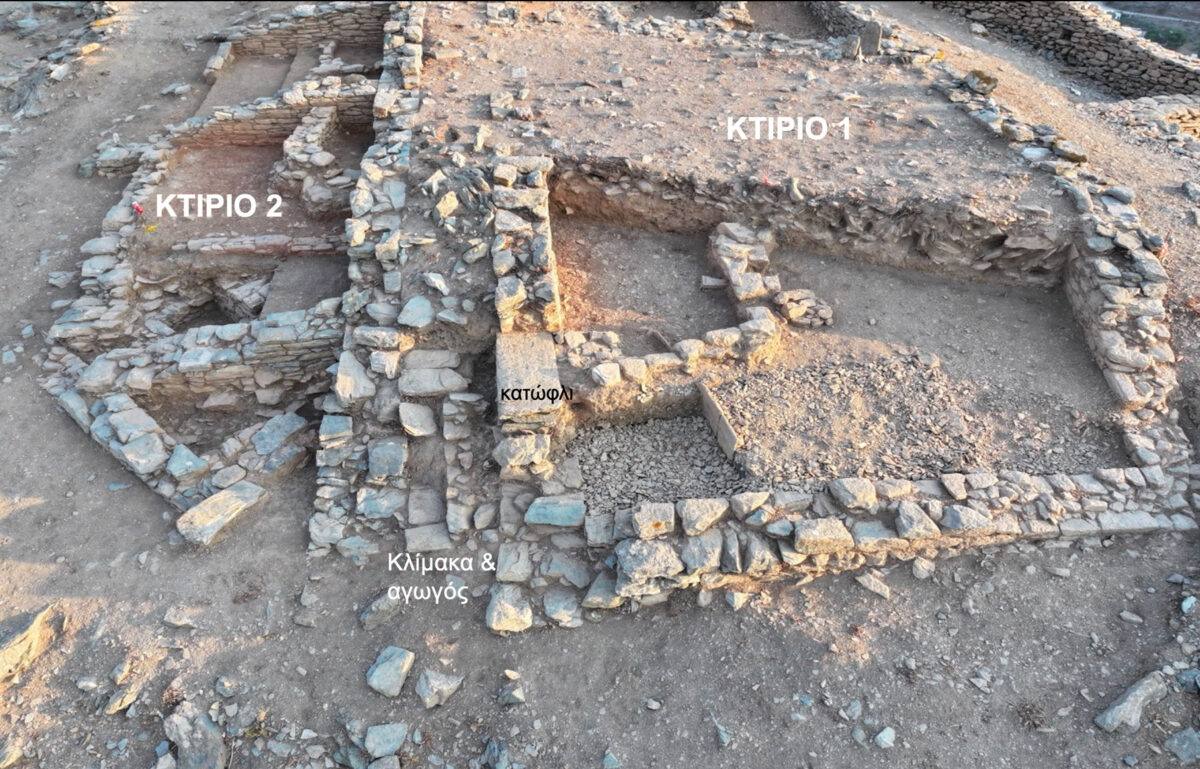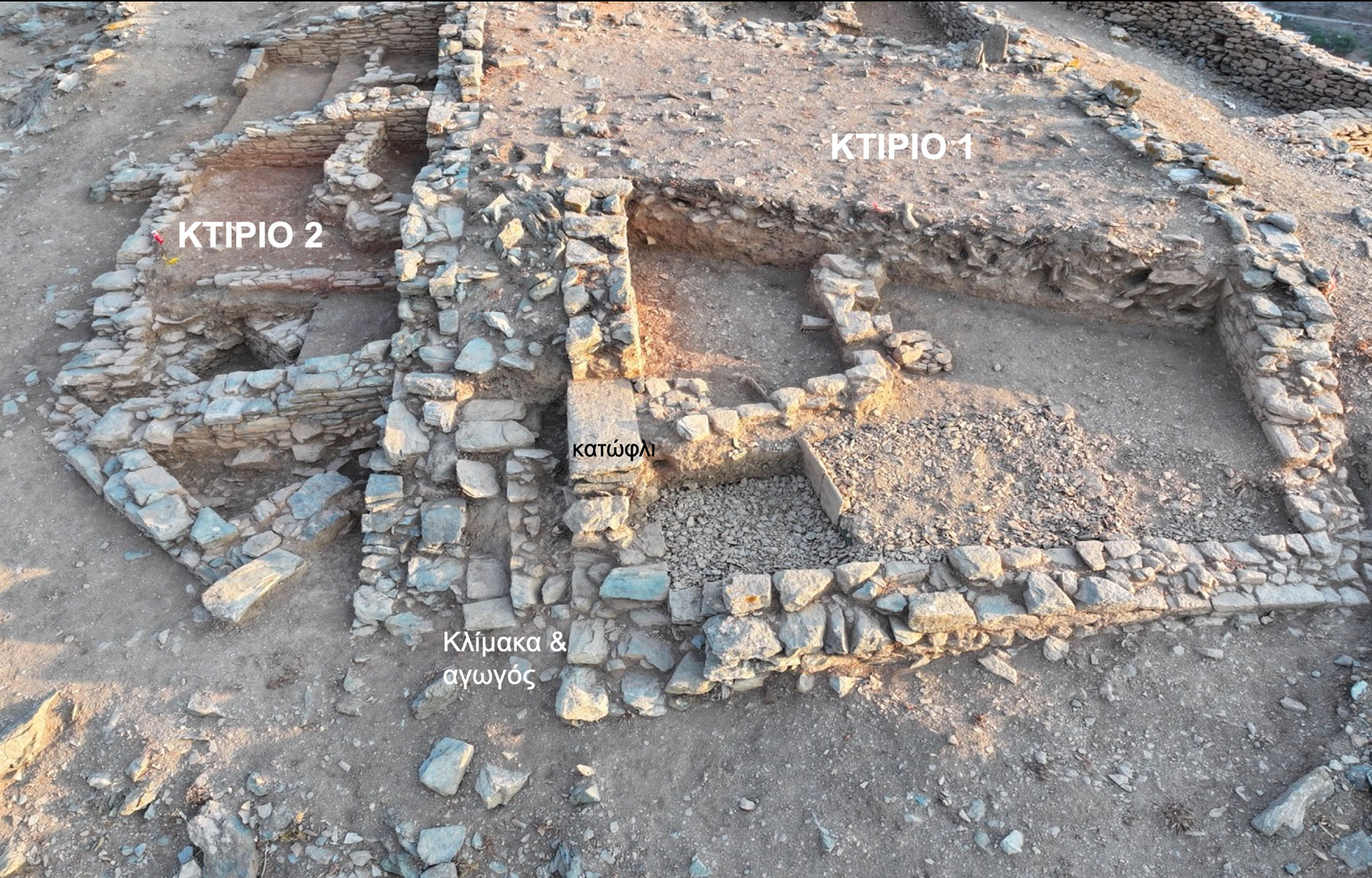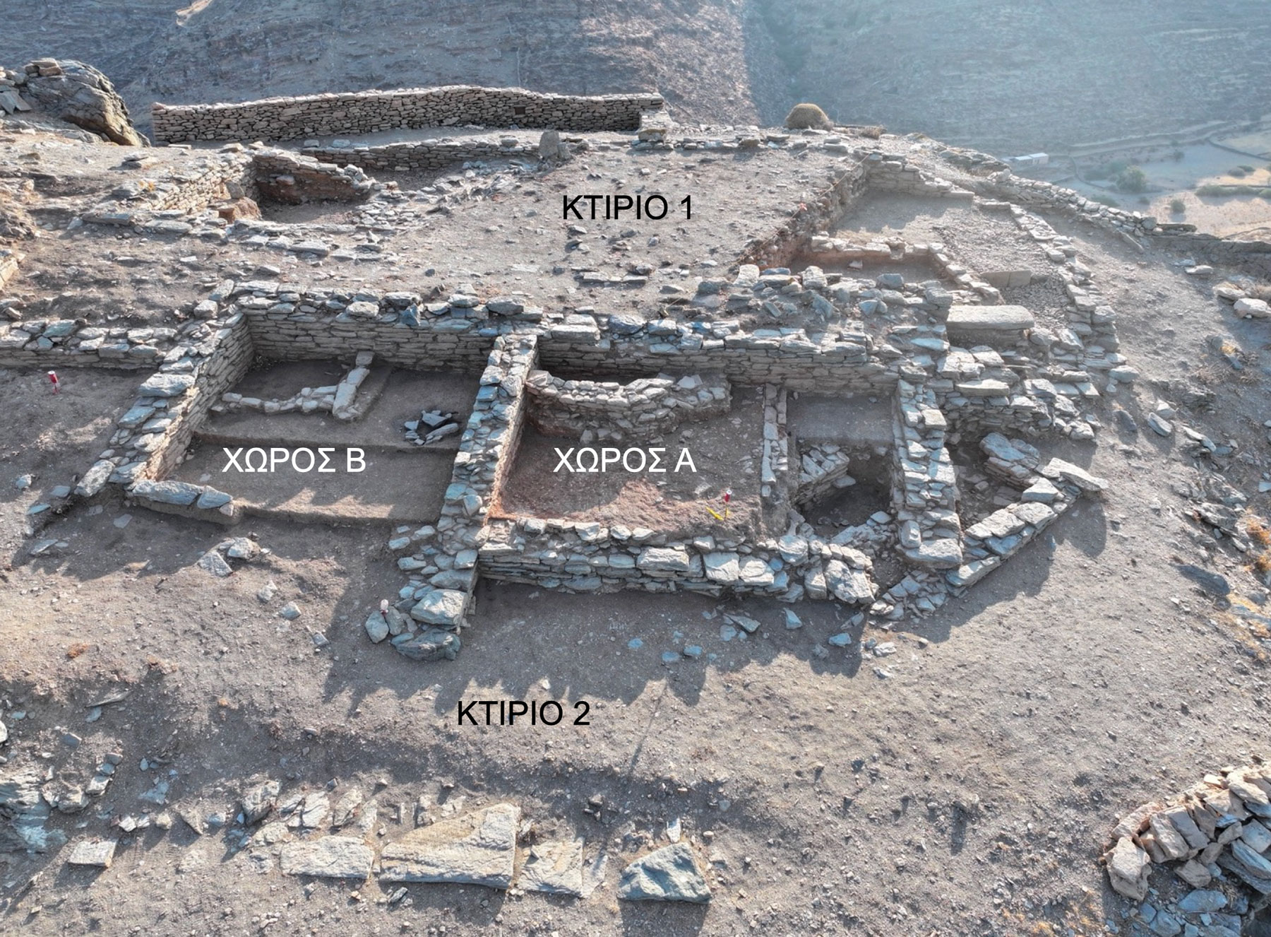 Η ανασκαφή του Κτιρίου 1 (διαστ. 15,40×6,90 μ.) (εικ. 7-8) περιορίστηκε στο νότιο άκρο του (το βόρειο είχε ανασκαφεί το 2021). Το στρώμα καταστροφής με πεσμένους λίθους και κεράμους κορινθιακού τύπου ήταν εκτεταμένο. Το μονολιθικό κατώφλι της εισόδου του κτιρίου αποκαλύφθηκε πλησίον της νότιας απόληξης του δυτικού τοίχου. Η γωνία αυτή, η ΝΔ του οικοδομήματος, φαίνεται ότι σε κάποιο στάδιο επισκευάστηκε. Η παρουσία πολλών πρώιμων οστράκων στις επιχώσεις κάτω από το δάπεδο υποδηλώνει και μια φάση χρήσης του χώρου, ίσως και του ίδιου του κτιρίου, κατά τους γεωμετρικούς και αρχαϊκούς χρόνους. Τα ευρήματα που συλλέχτηκαν από το στρώμα καταστροφής και τον πιθανό ορίζοντα χρήσης του κτιρίου ανήκουν στους ελληνιστικούς χρόνους και φανερώνουν οικιακή χρήση. Μεταξύ αυτών σημειώνουμε και αρκετά υφαντικά βάρη. Ξεχωρίζει επίσης ενσφράγιστη λαβή ροδιακού αμφορέα που σώζει το όνομα του μηνός Π]ΑΝΑΜΟΥ. Αξιοσημείωτη είναι η παρουσία δύο σιδερένιων αιχμών βελών (βλ. εικ. 16).