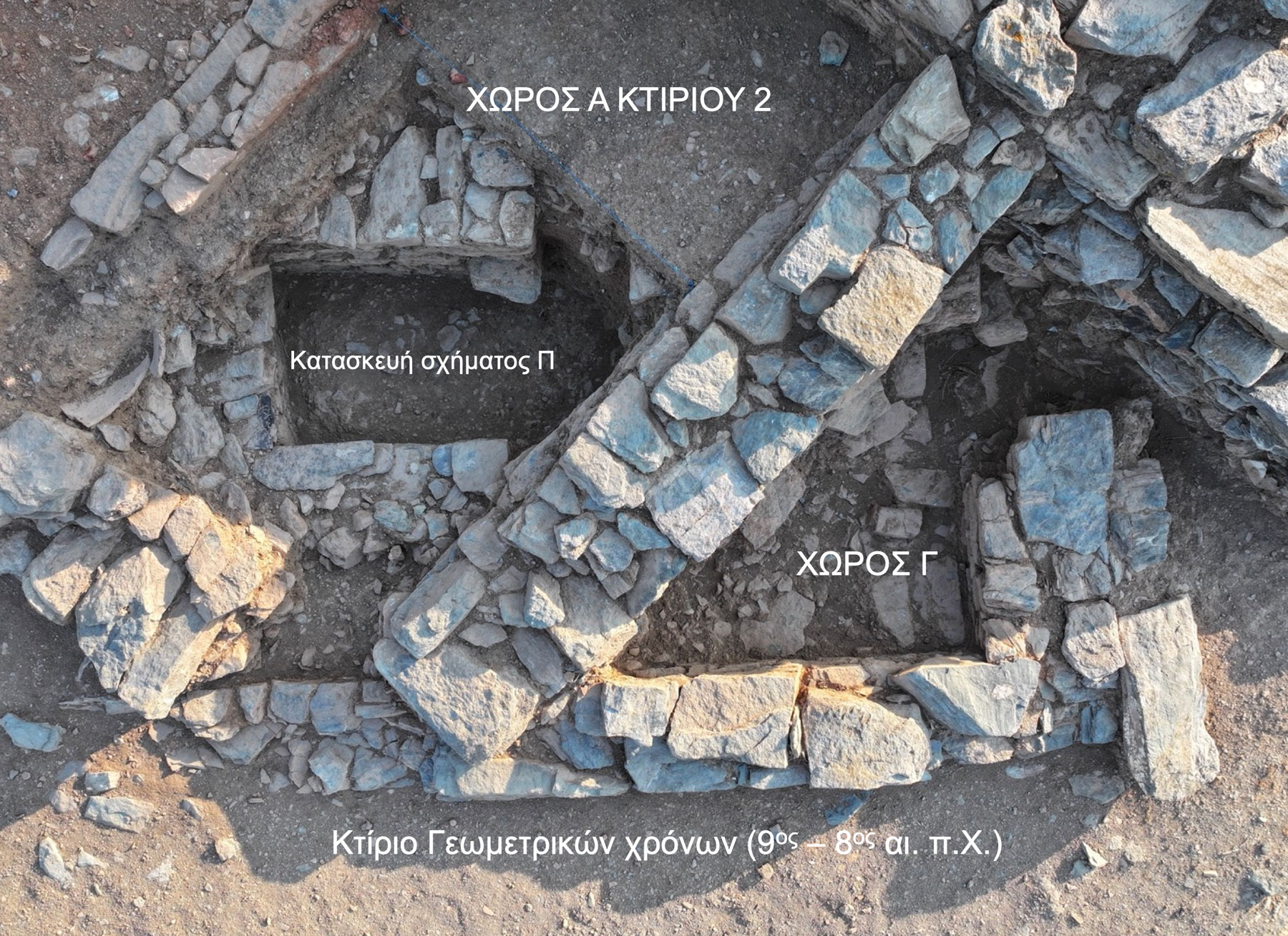 Δυτικά του Κτιρίου 1 εκτείνεται το Κτίριο 2. Πρόκειται για ένα τριμερές οικοδόμημα, με έναν τριγωνικό χώρο προς τα νότια (Γ) και δύο ορθογώνιους χώρους στο μέσον (Α) και στο βόρειο άκρο (Β) (εικ. 7-8). Ο τριγωνικός χώρος διαμορφώνεται από παλαιότερο τοίχο που χρησιμοποιήθηκε σε β’ φάση και φαίνεται ότι εκεί είχε διαμορφωθεί ή είσοδος του Κτιρίου 2 (εικ. 8-9). Ο Χώρος Α, εξωτερικών διαστάσεων 9,55×4,10 μ., διαιρείται σε δύο άνισα τμήματα από ένα εγκάρσιο τοιχάριο φοράς Α-Δ. Στο νότιο διαμέρισμα, όπου υποθέτουμε ότι βρισκόταν η θύρα, βρέθηκαν και 12 χάλκινες εφηλίδες. Εσωτερικά, στο κατώτερο τμήμα των τοίχων, διατηρείται κονίαμα με ερυθρό επίχρισμα. Ανάμεσα στα ευρήματα ξεχωρίζουν ορισμένες χάλκινες και σιδερένιες αιχμές βελών. Ο τετράγωνος Χώρος Β διαιρείται και αυτός σε δύο ίσους χώρους από ένα εγκάρσιο τοιχάριο. Στο νότιο διαμέρισμα ήρθε στο φως μια πρόχειρη κυκλοτερής εστία. Από το εσωτερικό του Χώρου Β προέρχονται αρκετά υφαντικά βάρη (αγνύθες και σφονδύλια). Η έρευνα στο εσωτερικό του τριγωνικού Χώρου Γ και σε δοκιμαστική τομή σε βάθος εντός του νότιου τμήματος του Χώρου Α έφερε στο φως ένα προγενέστερο οικοδόμημα που ακολουθεί διαφορετικό προσανατολισμό (εικ. 9). Το οικοδόμημα αυτό εσωτερικά καταλαμβάνεται από ογκώδη κατασκευή σχήματος Π, η οποία στην άνω της επιφάνεια σώζει ίχνη από λευκό κονίαμα. Ο χώρος εσωτερικά της κατασκευής, πλάτους 0,80 μ. και μήκους 1 μ., απέδωσε όστρακα και μικρά ευρήματα των γεωμετρικών (κυρίως υστερογεωμετρικών) και πρώιμων αρχαϊκών χρόνων. Ανάμεσα στα ευρήματα συγκαταλέγονται πήλινο γυναικείο ειδώλιο Αργείτικου τύπου (εικ. 10 μέσον) και πολλά θραύσματα από μεγάλο πίθο, του οποίου σώζεται και μία κάθετη ταινιωτή περίτμητη λαβή (εικ. 10 πάνω αριστερά).