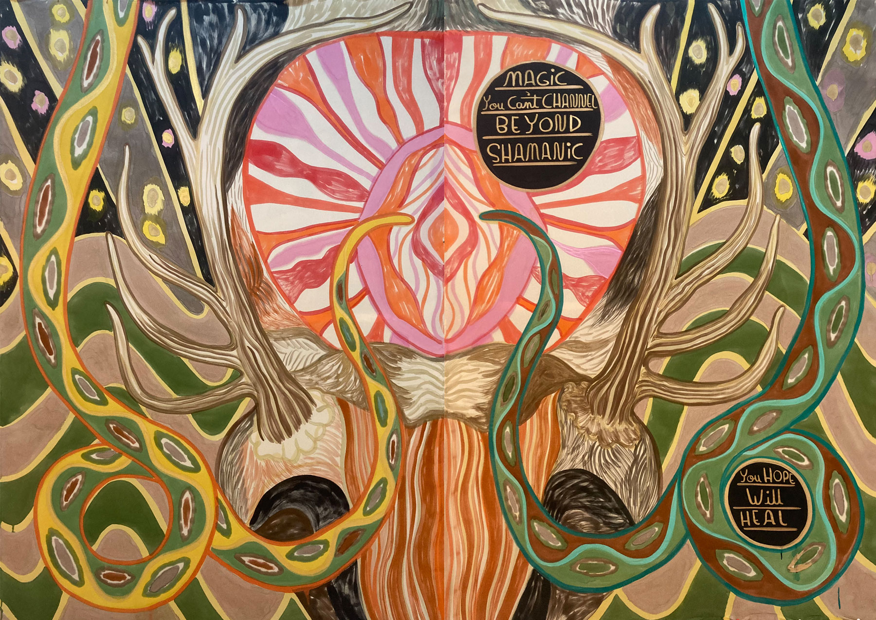 Η Emma Talbot, γνωστή για τις μεγάλης κλίμακας εγκαταστάσεις ζωγραφικής σε μετάξι, εγείρει με τα έργα της ζητήματα σχετικά με την οικολογία και το περιβάλλον, στα οποία συνδυάζει ζωγραφική, σχέδιο, κινούμενα σχέδια και γλυπτική μεγάλης κλίμακας με χαρακτηριστικές εικόνες, μυθολογικά και ρυθμικά μοτίβα, ζωηρά χρώματα και καλλιγραφικά κείμενα. Το «Human/Nature», σε ανάθεση του ΕΜΣΤ, αποτελείται από μια μνημειώδη υφασμάτινη εγκατάσταση, ύψους 9 μέτρων, από βαμμένο μετάξι και μια συνοδευτική ταινία κινουμένων σχεδίων με τίτλο You Are Not the Center (inside the animal mind) / Δεν είσαι το επίκεντρο (μέσα στο μυαλό του ζώου). Σε αυτά –όπως και σε πολλά από τα έργα της Emma Talbot– υπάρχει μια γυναίκα πρωταγωνίστρια/οικοφεμινίστρια –μια εκδοχή της ίδιας της καλλιτέχνιδας– που πάντα ψάχνει και εξερευνά, προσπαθεί να κατανοήσει τον κόσμο. Μαζί, τα δύο αυτά έργα επιδιώκουν να ξεδιαλύνουν τις αγκυλώσεις ανθρώπου-φύσης και να οραματιστούν τη δυνατότητα ενός εναλλακτικού, καλύτερου μέλλοντος.