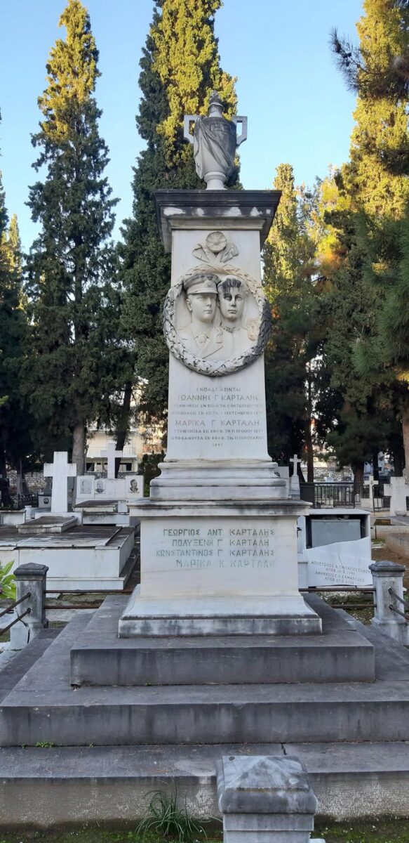 Η οικογένεια Καρτάλη όμως είχε ένα ακόμη ταφικό μνημείο, όπου υπάρχει μία επιτύμβια στήλη με ένα εξαιρετικό γλυπτό που αποτυπώνει έναν άντρα και μία γυναίκα, με την επιγραφή «Ενθάδε κείνται Ιωάννης Γ. Καρτάλης, γεννηθείς εν Βόλω τη 5 Οκτωβρίου 1876. Αποθανών εν Κω, τη 1 Σεπτεμβρίου 1891. Μαρίκα Γ. Καρτάλη, γεννηθείσα εν Βόλω τη 14 Ιουλίου 1873, αποθανούσα εν Βόλο τω 14 Ιανουαρίου 1892».