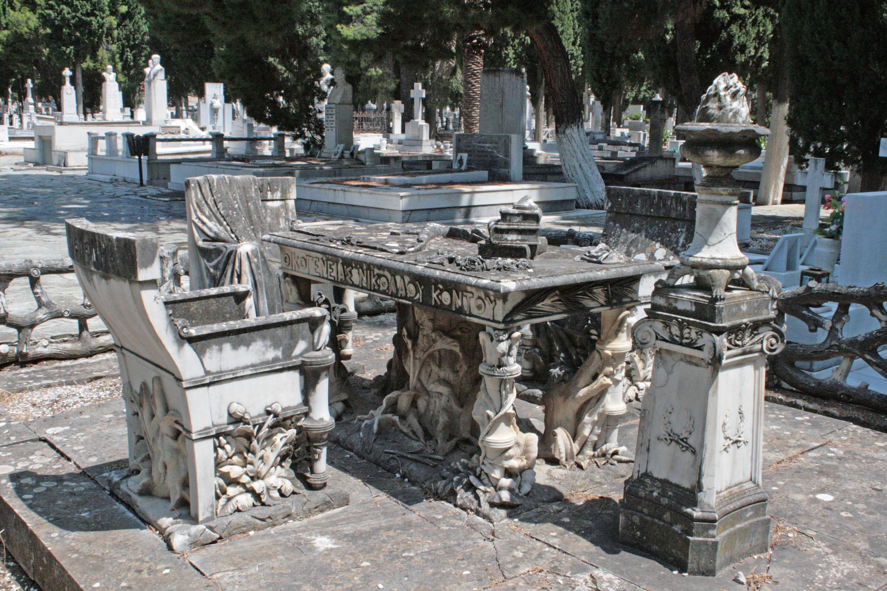 Λίγο πιο πάνω και απέναντι από το ναό βρίσκεται το περίφημο μνημείο της οικογένειας Νικολάου Κοντού, που αναπαριστά σε μάρμαρο μία τραπεζαρία με ένα τραπέζι και τρεις καρέκλες, σε κάθε μία από τις οποίες αναγράφεται και το όνομα ενός παιδιού. Η ιστορία λέει ότι τα τρία παιδιά του Ν. Κοντού, ο Κωνσταντίνος, η Ελένη και η Κατίνα, πέθαναν με αιφνίδιο θάνατο έπειτα από δηλητηρίαση που υπέστησαν όταν ένα σαμιαμίδι έπεσε στο γάλα που ήπιαν με το πρωινό τους. Ο Ν. Κοντός ζήτησε τότε από τους γλύπτες αδελφούς Κοτζαμάνη από την Αθήνα να δημιουργήσουν ένα ταφικό μνημείο που να μείνει στην ιστορία και συγκινημένοι οι γλύπτες σκέφτηκαν να δημιουργήσουν ένα μνημείο που θα θύμιζε για πάντα τον τρόπο που «έφυγαν» τα τρία παιδιά, αλλά και το υψηλό κοινωνικό επίπεδο της οικογένειας.