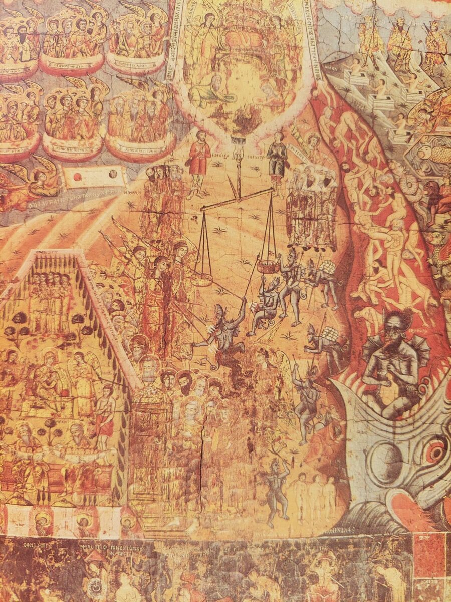 Μια ακόμη ενδιαφέρουσα εικόνα είναι εκείνη της Δευτέρας Παρουσίας που, σύμφωνα με τον πατέρα Απόστολο, «συνήθως στα παλιά μοναστήρια και σε παλιές εκκλησίες βρίσκεται στην είσοδο του ναού ώστε οι μοναχοί μπαίνοντας και βγαίνοντας από το ναό να θυμούνται ότι δεν τελειώνουν όλα εδώ, υπάρχει και η μέλλουσα κρίση». Η σχετική αναπαράσταση σε φορητή εικόνα, που είναι γνωστή ως «τα διαβολούδια» θεωρείται σπάνια και χρονολογείται στον 14ο με 15ο αιώνα. Πριν από χρόνια βρισκόταν στην είσοδο του ναού ενώ αργότερα μεταφέρθηκε στο εσωτερικό του.