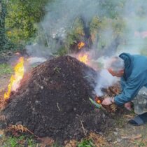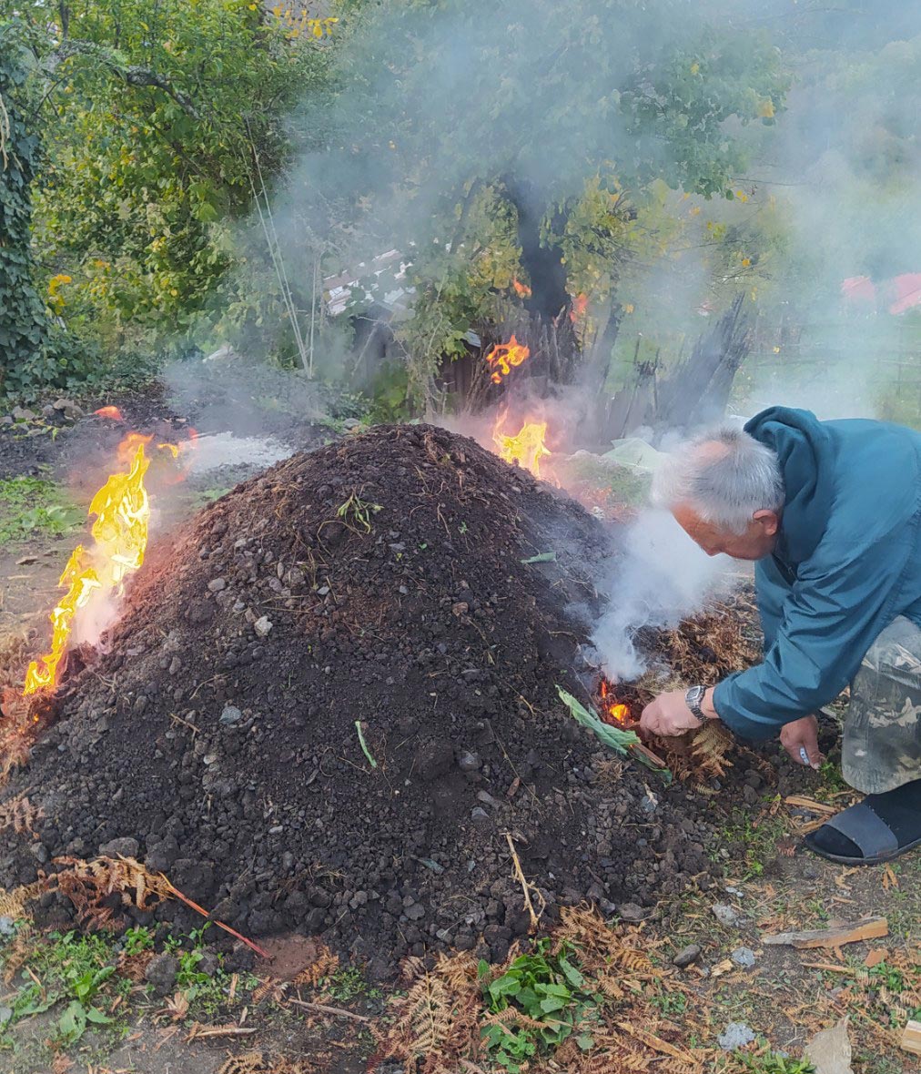 »Στην συνέχεια, τα σκέπαζαν με φτέρη και στρώμα χώματος, έτσι ώστε η καύση να είναι ατελής, με ελάχιστη ποσότητα οξυγόνου και διαρκούσε 15 ημέρες. Γι’ αυτό ο κατρανάς μέρα νύχτα έπρεπε να είναι παρών, να επιτηρεί συνεχώς τη διαδικασία της καύσης.