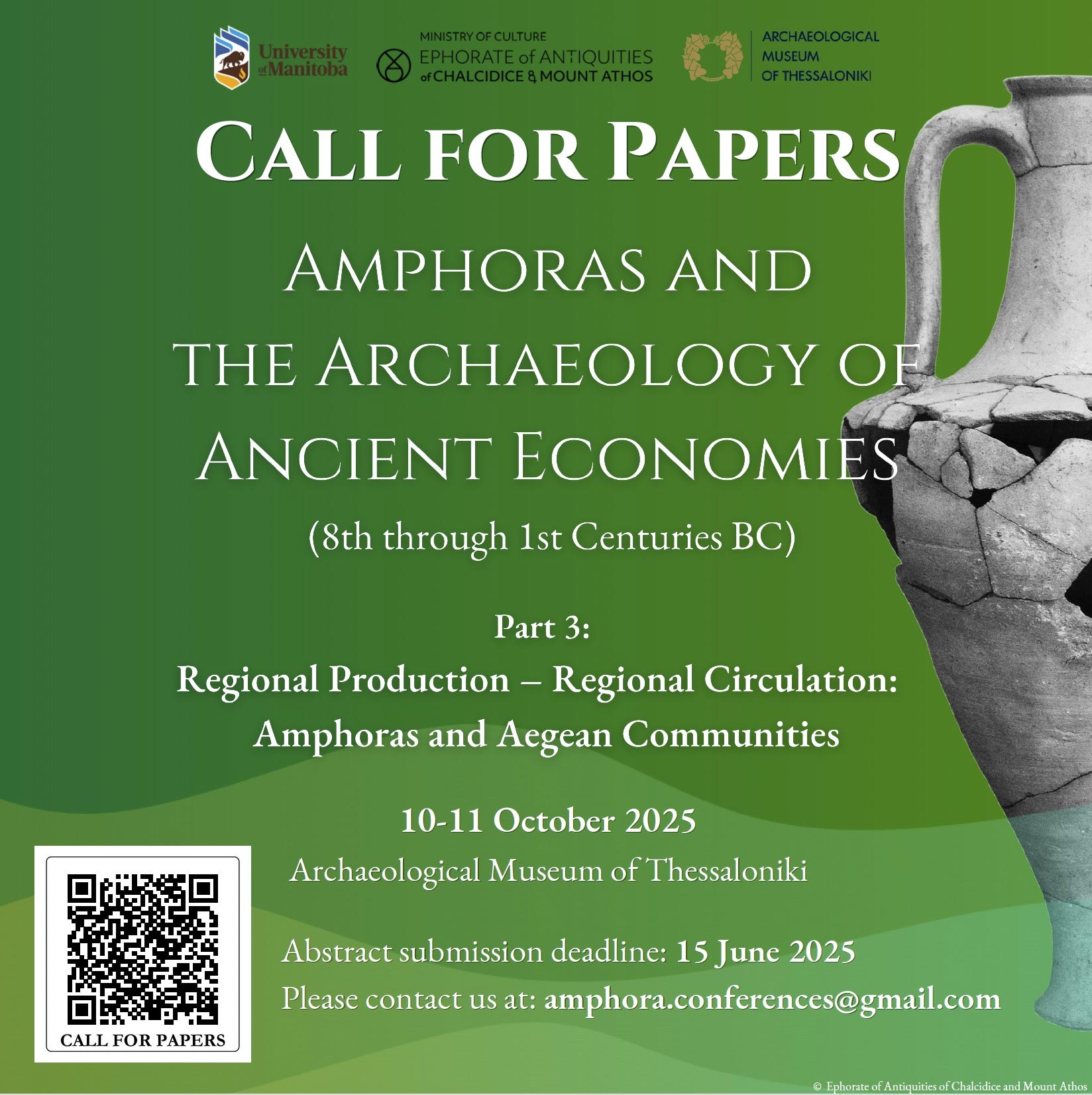 Η Εφορεία Αρχαιοτήτων Χαλκιδικής και Αγ. Όρους σε συνεργασία με το Αρχαιολογικό Μουσείο Θεσσαλονίκης διοργανώνουν στις 10 και 11 Οκτωβρίου 2025 επιστημονικό συνέδριο με τίτλο «Amphoras and the Archaeology of Ancient Economies (8th through 1st Centuries BC). Part 3 THESSALONIKI: Regional Production – Regional Circulation: Amphoras and Aegean Communities»