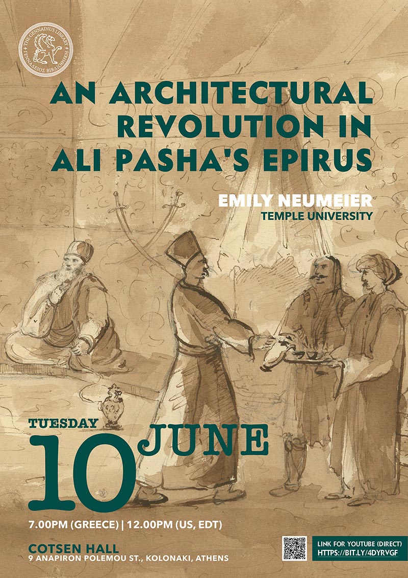 «An Architectural Revolution in Ali Pasha’s Epirus» («Μία αρχιτεκτονική επανάσταση στην Ήπειρο του Αλή Πασά») είναι ο τίτλος υβριδικής διάλεξης (στα αγγλικά) που θα δώσει η Emily Neumeier (Πανεπιστήμιο Temple) την Τρίτη 10 Ιουνίου 2025 και ώρα 19.00. Τη διάλεξη διοργανώνει η Γεννάδειος Βιβλιοθήκη της Αμερικανικής Σχολής Κλασικών Σπουδών στην Αθήνα.