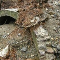 β) τη ζώνη του ρέματος Αγίας Παρασκευής, κοντά στο κτήριο των χώρων υγιεινής των επισκεπτών και στην όμορη κατεστραμμένη λιθόστρωτη διάβαση, και