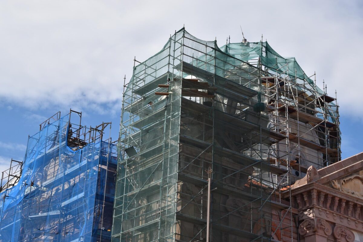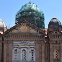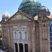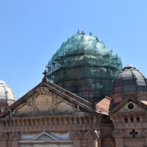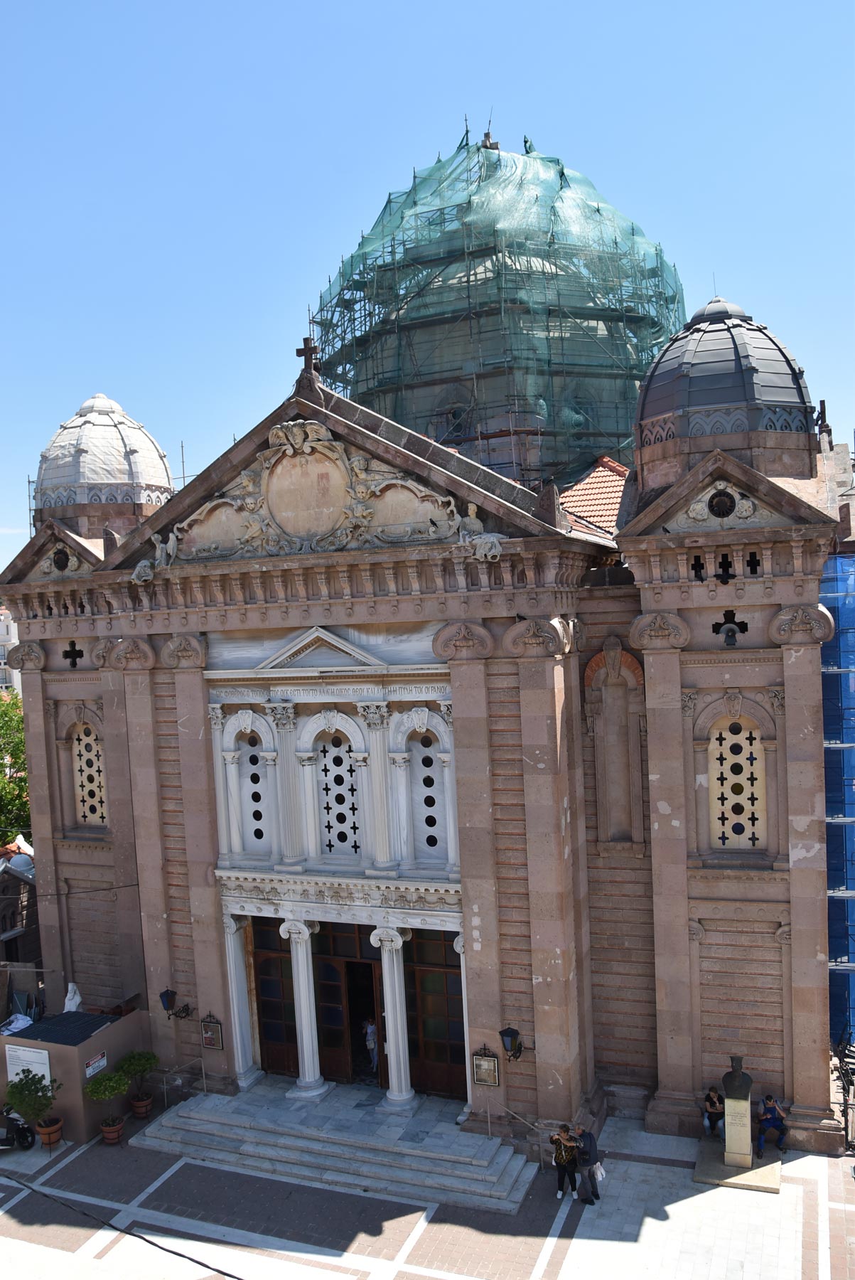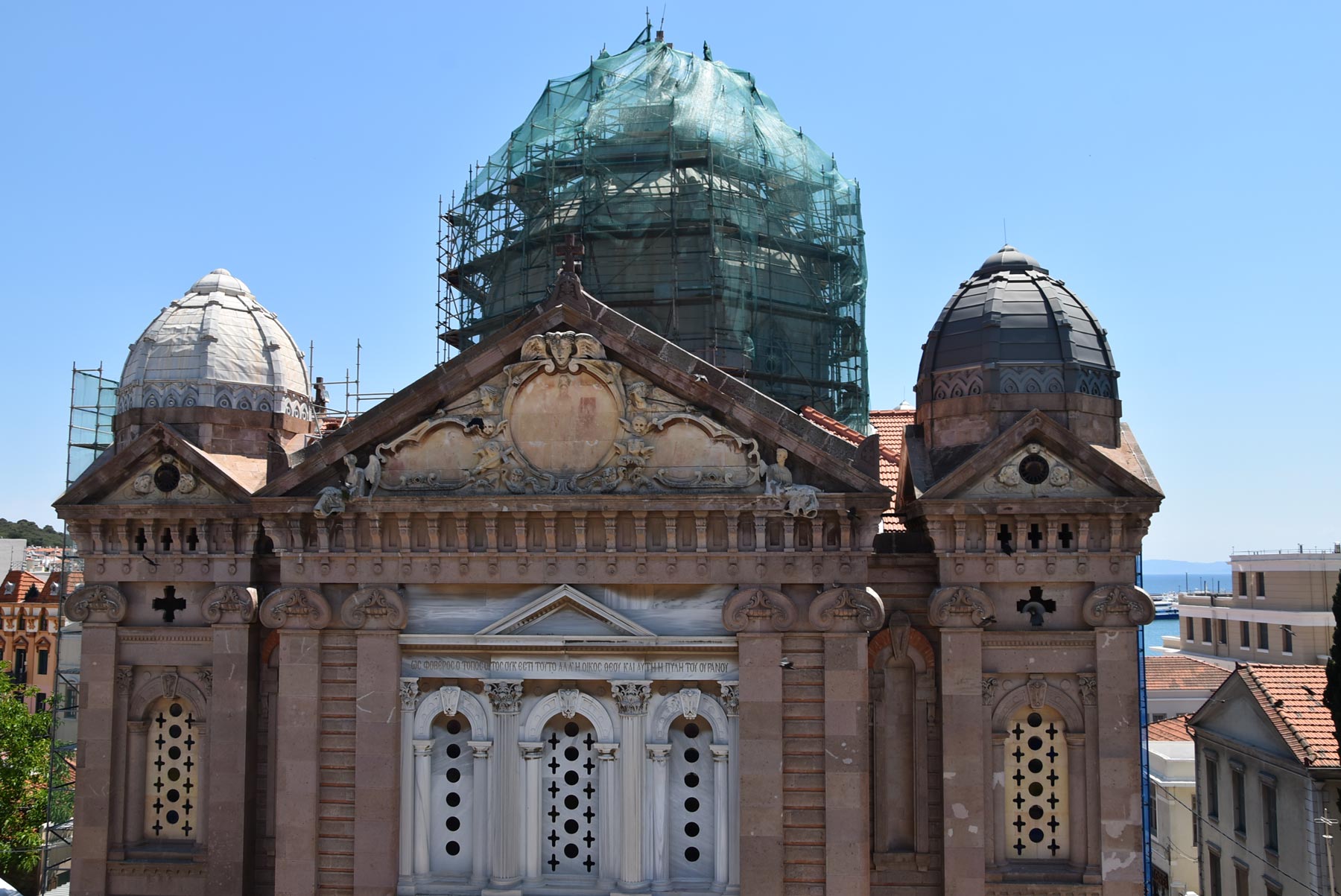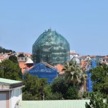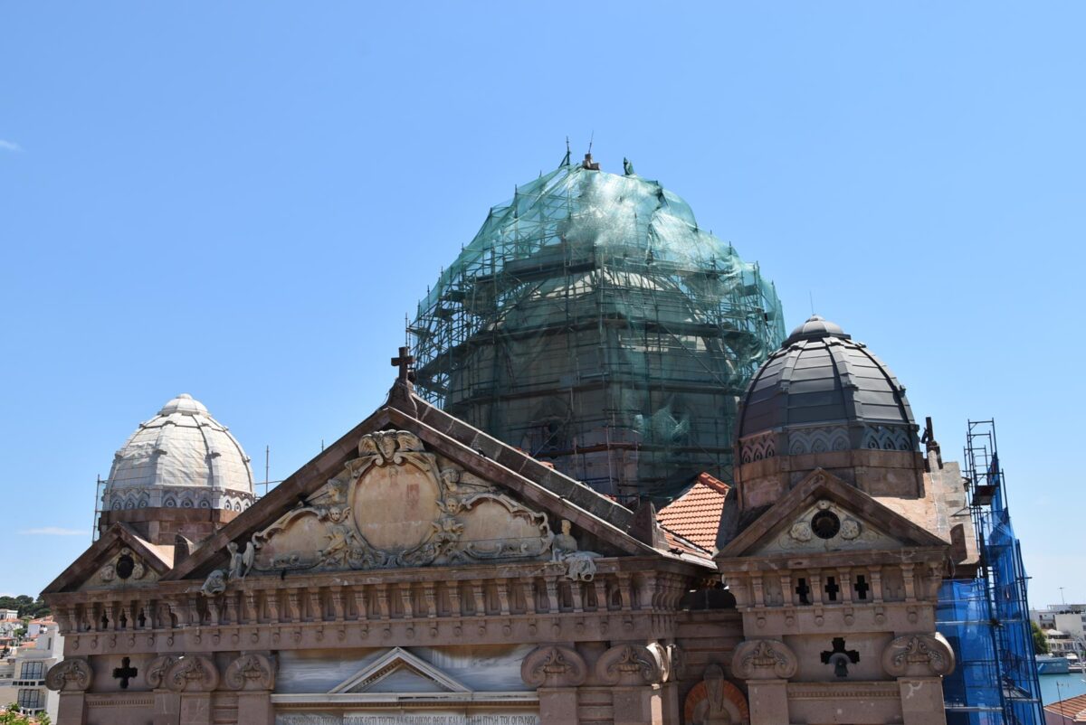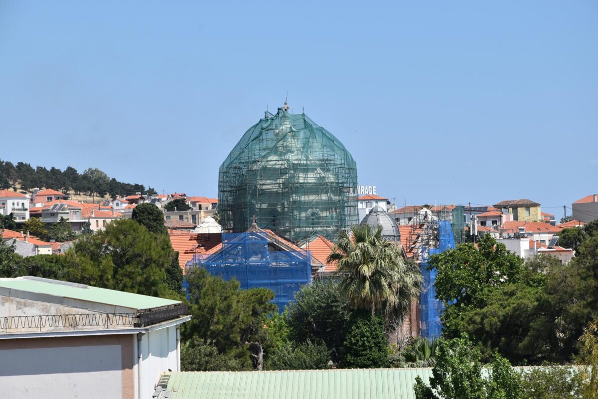 Με εντατικούς ρυθμούς συνεχίζονται οι εργασίες αντικατάστασης του ψευδαργύρου με τον οποίο είναι καλυμμένοι ο μεγάλος κεντρικός τρούλος και οι τέσσερις τρουλίσκοι της οροφής του ναού του Αγίου Θεράποντα. Του ναού που αποτελεί σήμα κατατεθέν της Μυτιλήνης.