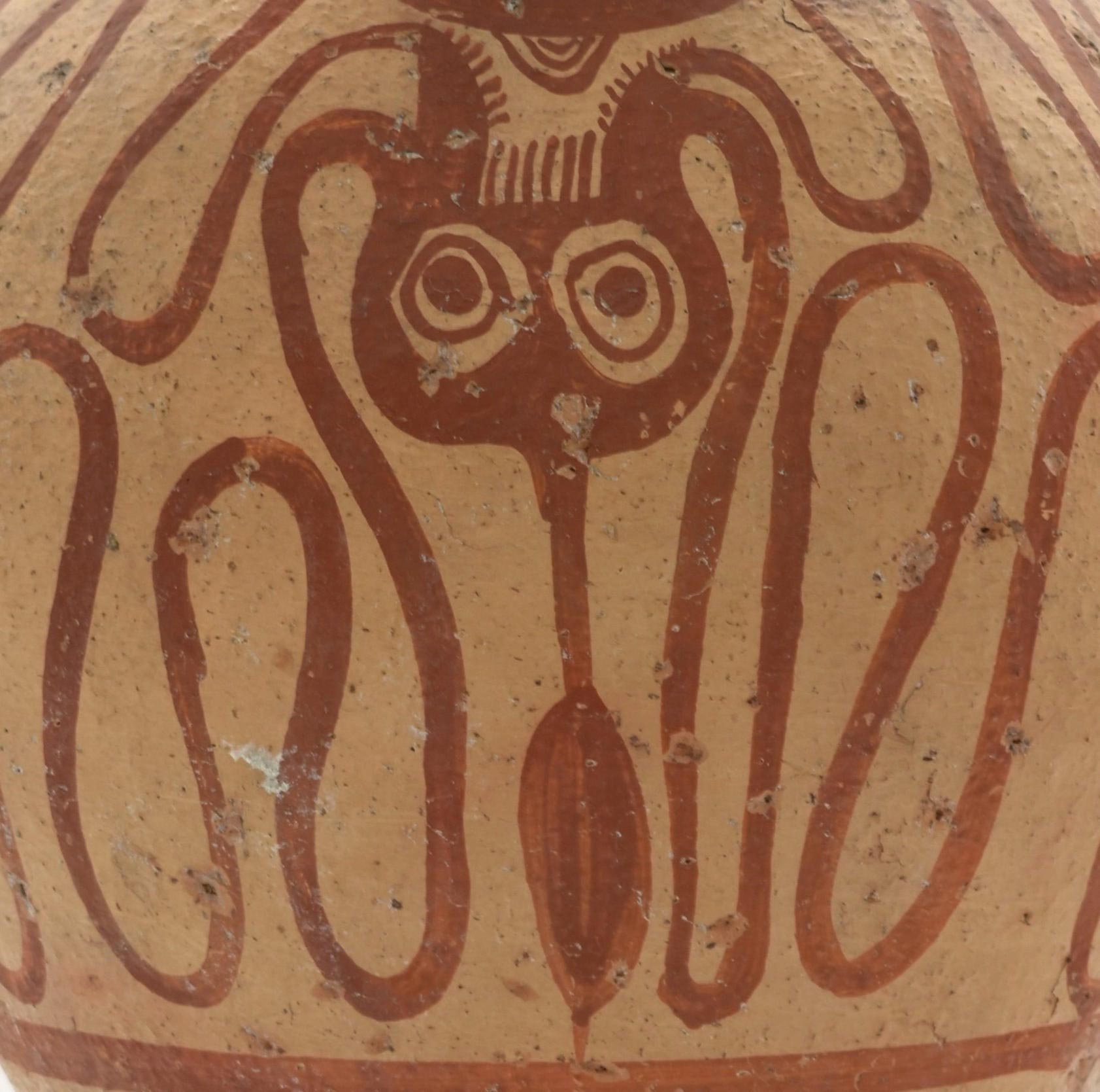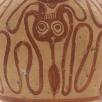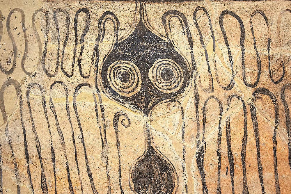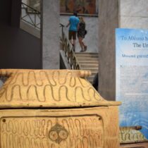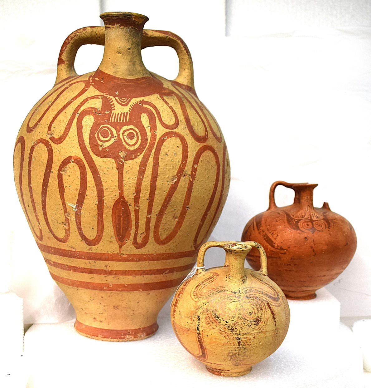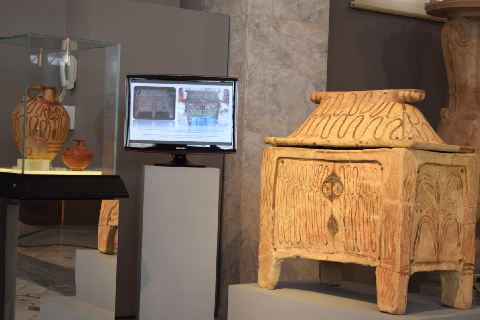 Μεγάλα ζωγραφιστά χταπόδια απλώνονται στις όψεις της λάρνακας και τυλίγουν σφιχτά τα σώματα των αγγείων, εγείροντας υποψίες για τον αινιγματικό συμβολισμό του θαλάσσιου πλάσματος στη σφαίρα της μινωικής θεολογίας του θανάτου. Η λάρνακα και τα τρία αγγεία προέρχονται από τη Μινωική Συλλογή του Εθνικού Αρχαιολογικού Μουσείου και παρουσιάζονται στην έκθεση για πρώτη φορά.