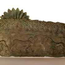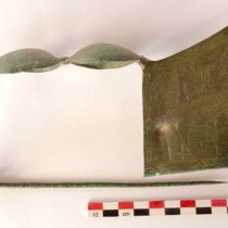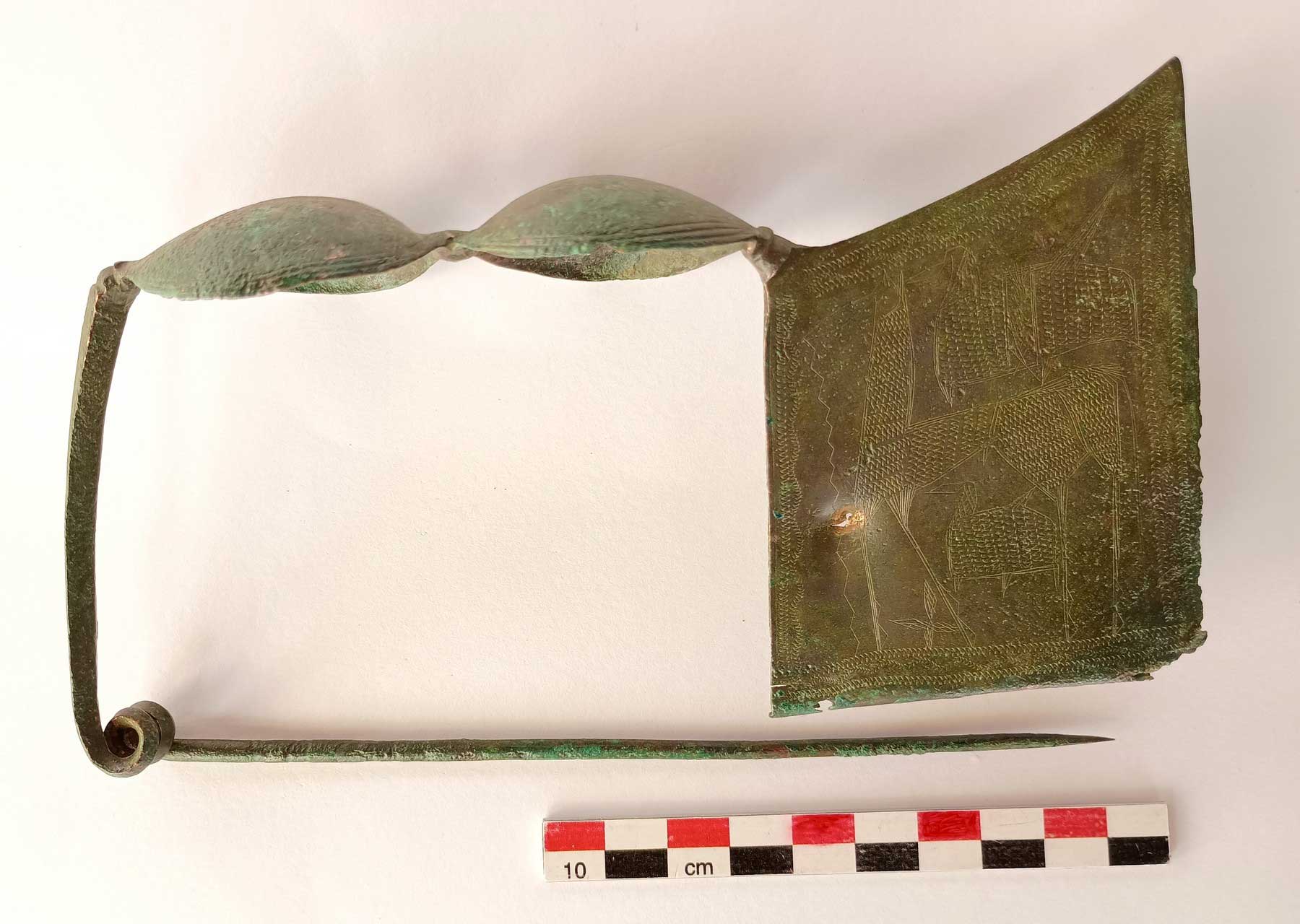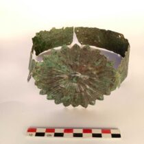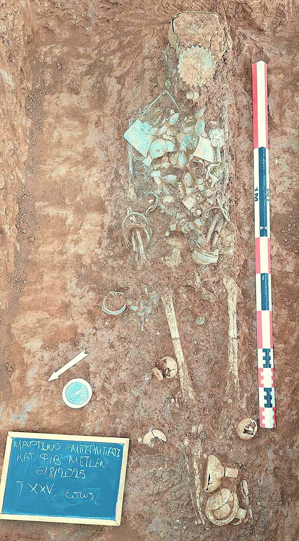 Ιδιαίτερα εντυπωσιακή είναι η «Ταφή της αρχόντισσας με το ανεστραμμένο διάδημα», που χρονολογείται στο β’ μισό του 7ου αι. π.Χ. και αποτελεί μέρος μιας συστάδας τριών λακκοειδών τάφων. Η ταφή της αρχόντισσας, σύμφωνα με την προκαταρκτική εξέταση των οδοντικών καταλοίπων, ανήκει σε ενήλικη γυναίκα 20-30 ετών. Στην κεφαλή της είχε τοποθετηθεί τελετουργικά, ως σύμβολο της υπεροχής και του αξιώματός της, εντυπωσιακό χάλκινο ταινιωτό διάδημα με επίστεψη μεγάλου ρόδακα, «εν είδει ήλιου» στο κέντρο του μετώπου. Το περίτεχνο διάδημα είναι κατασκευασμένο με την έκκρουστη τεχνική και φέρει τρέχουσα διακόσμηση αντωπών ζευγών εραλδικών λεόντων, αρσενικού και θηλυκού γένους, ζώων που κατεξοχήν συμβολίζουν τη βασιλική δύναμη και εξουσία. Ωστόσο το διάδημα είχε τοποθετηθεί στην κεφαλή της νεκρής ανεστραμμένο με τους λέοντες σε ύπτια θέση και το κόσμημα πλοχμού στο κάτω άκρο του. Στη σύγχρονη εποχή το στέμμα του βασιλιά φορεμένο ανεστραμμένο, συμβολίζει την παραίτηση ή την πτώση του μονάρχη, και σε κάθε περίπτωση σηματοδοτεί την απώλεια της εξουσίας και του αξιώματός του. Η ταφή της αρχόντισσας εντάσσεται χρονολογικά στο μεταβατικό κοινωνικοπολιτικό πλαίσιο των μέσων του 7ου αι. π.Χ., περίοδο κατά την οποία είχε κλονιστεί το πολίτευμα της πατροπαράδοτης κληρονομικής βασιλείας και η άνοδος των αρίστων ευγενών οδήγησε κατά την επόμενη περίοδο στην επικράτηση της ολιγαρχίας και του αριστοκρατικού πολιτεύματος. Το αξίωμα, το κύρος και ο πλούτος της εν λόγω ταφής αποδεικνύεται από τα πολυάριθμα χάλκινα κτερίσματα. Εντυπωσιακό είναι το πλήθος των κτερισμάτων, ανάμεσα στα οποία ξεχωρίζουν οι δυο υπερμεγέθεις πόρπες βοιωτικού τύπου με εγχάρακτη γεωμετρική διακόσμηση αλόγων, το περιδέραιο με μεγάλο αγγειόσχημο περίαπτο, οι οστέινες, ελεφαντοστέινες χάνδρες, οι ψήφοι από ήλεκτρον (κεχριμπάρι), οι ελασμάτινοι ρόδακες, τα χάλκινα ενώτια, τα ψέλλια (βραχιόλια) και τα σπειροειδή δακτυλίδια που φορούσε σε όλες τις φάλαγγες των δακτύλων.