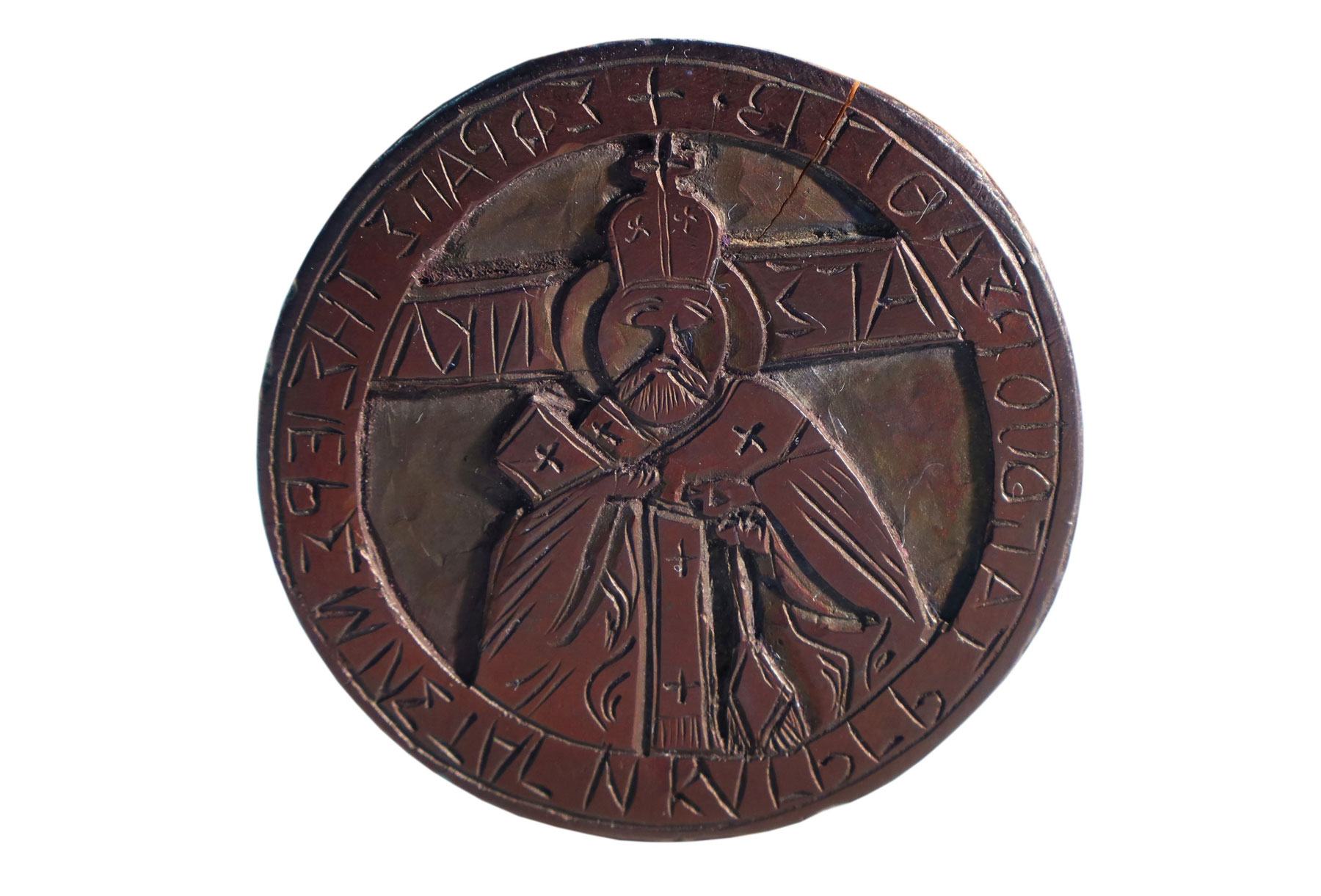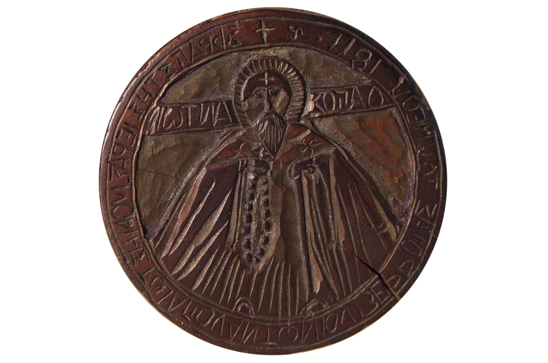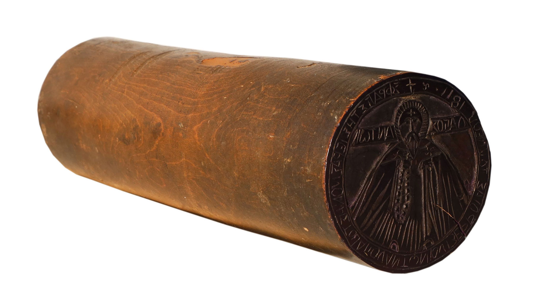 Η σφραγίδα είναι ξύλινη, κυλινδρικού σχήματος, μήκους 18,8 εκατοστών και διαμέτρου 5 εκατοστών, και φέρει δύο εγχάρακτες σφενδόνες στα άκρα της. Η πρώτη χρονολογείται στο 1713 και απεικονίζει τον Άγιο Νικόλαο, με επιγραφή που δηλώνει ότι ανήκε στην Ιερά Μονή Αγίου Νικολάου Γρηγορίου του Αγίου Όρους. Ο άγιος αποδίδεται ημίσωμος, με αρχιερατικά άμφια και μίτρα, κρατώντας κλειστό Ευαγγέλιο και ευλογώντας, σύμφωνα με τον καθιερωμένο εικονογραφικό τύπο.