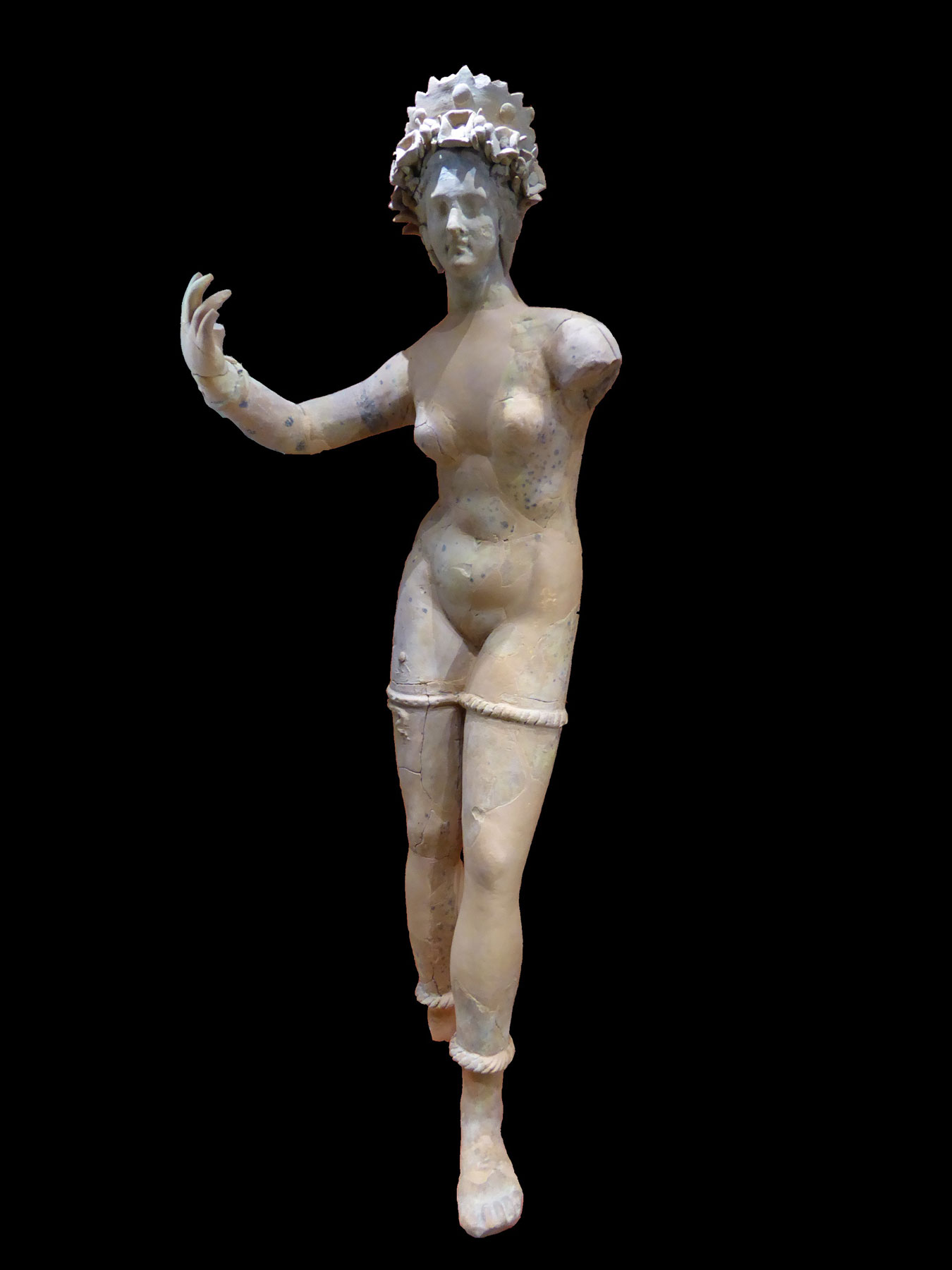 Η θεά εμφανίζεται με νεανικό, εύπλαστο σώμα. Στο κεφάλι φέρει ψηλή στεφάνη διακοσμημένη με άνθη και καρπούς, που παραπέμπει σε γαμήλιους και γονιμικούς συμβολισμούς. Στο δεξί χέρι φορά ψέλλιο (βραχιόλι), ενώ στους μηρούς διακρίνονται περιμήρια που καταλήγουν σε κεφαλές φιδιών, συνοδευόμενα από επισφύρια (περικάρπια αστραγάλων).