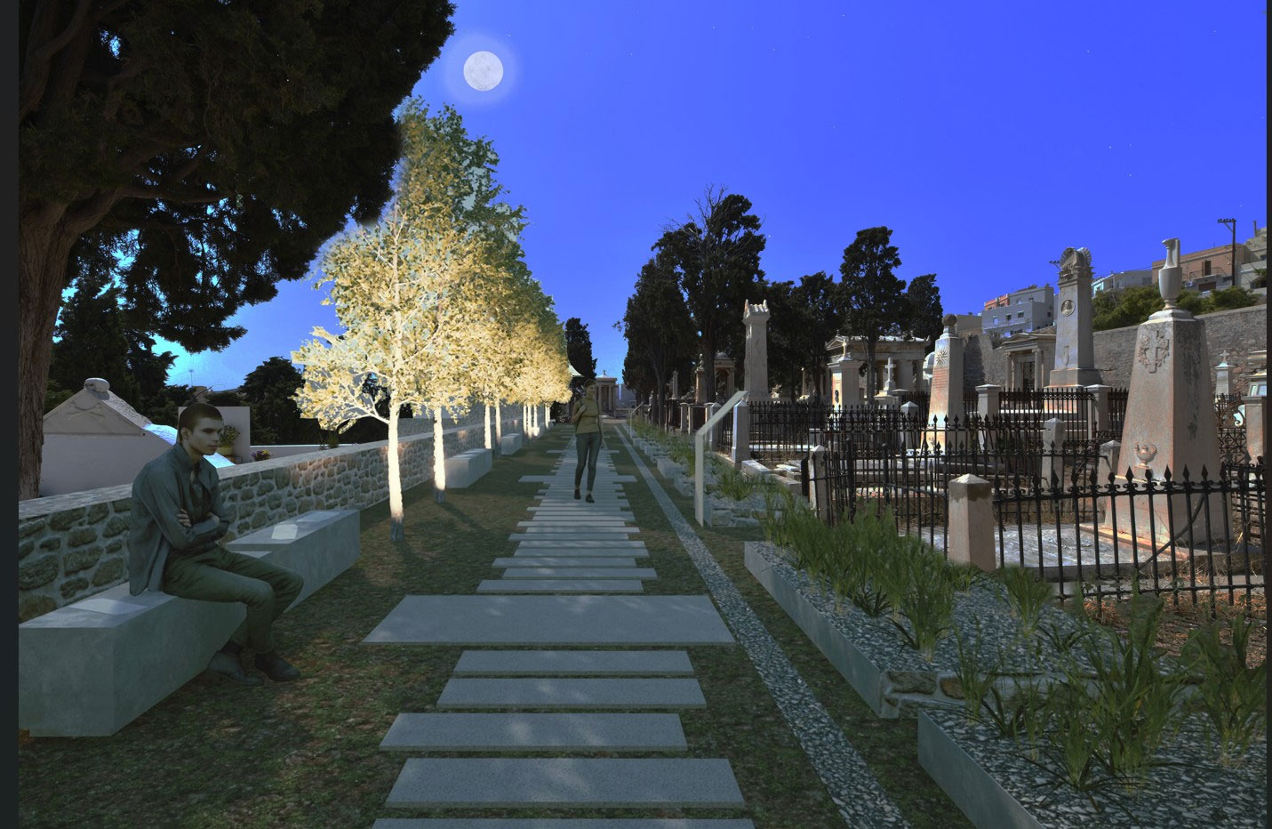 Η αρχιτεκτονική πρόταση βασίζεται στις –διεθνώς– αναγνωρισμένες αρχές συντήρησης και ανάδειξης μνημειακών χώρων, αντλώντας παραδείγματα καλών πρακτικών από ευρωπαϊκά εμβληματικά νεκροταφεία. Η πρόταση ανάδειξης του κοιμητηρίου περιλαμβάνει τρεις διακριτούς τομείς, καθένας εκ των οποίων διαθέτει ιδιαίτερα τυπολογικά, μορφολογικά και ιστορικά χαρακτηριστικά, τα οποία αναδεικνύονται με στοχευμένες ήπιες επεμβάσεις. Ο χώρος εισόδου διαμορφώνεται ως υπαίθριος εκθεσιακός χώρος, όπου επανεντάσσονται ιστορικές επιτύμβιες πλάκες και λιθανάγλυφα. Οι τοίχοι λειτουργούν ως εκθεσιακές επιφάνειες και τοποθετούνται ενημερωτικές πινακίδες για την ιστορία και τη δομή του χώρου. Σχεδιάζεται διακριτικός αρχιτεκτονικός φωτισμός με στόχο την ανάδειξη των μνημείων και τη διατήρηση της ατμόσφαιρας μνήμης και περισυλλογής.