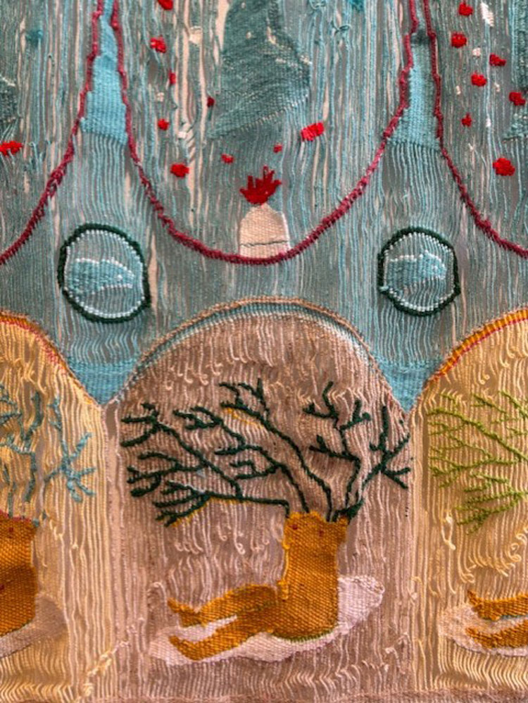 «Η αρχική επαφή μου με τη λαϊκή τέχνη είχε θεραπευτικό χαρακτήρα. Μου άρεσε να χάνομαι στα μεγάλα υφαντά χαλιά γιατί εκεί ένιωθα θαλπωρή, ζεστασιά και ασφάλεια. Τα μοτίβα με τις ανθρώπινες φιγούρες στην ίδια κλίμακα με τα ζώα και τα φυτά, τα αφαιρετικά σύμβολα γονιμότητας και τα αποτροπαϊκά σχέδια με ταξίδευαν σε κόσμους αλλοτινούς, σε χρώματα, νήματα και αργαλειούς που τροφοδοτούν μέχρι σήμερα το έργο μου». Με αυτά τα λόγια η Ιωάννα Τερλίδου αποκαλύπτει τον βιωματικό πυρήνα της εικαστικής της αναζήτησης ως σύγχρονη δημιουργός με πολυετή παρουσία στον χώρο, αντλώντας έμπνευση από το υλικό και άυλο απόθεμα του ελληνικού πολιτισμού. Με κύριο συνεργάτη της τον όρθιο αργαλειό, επεξεργάζεται το νήμα ως φορέα μνήμης και ύλης. Δημιουργεί συνθέσεις που συνδυάζουν νατουραλιστικά και γεωμετρικά μοτίβα, με έντονες χρωματικές αντιθέσεις σε λεπτοδουλεμένες επιφάνειες. Άνθη, ανθρώπινες μορφές και συμβολικά στοιχεία συνυπάρχουν σε έναν υφαντό κόσμο, όπου η παράδοση μετασχηματίζεται σε σύγχρονη εικαστική γλώσσα.