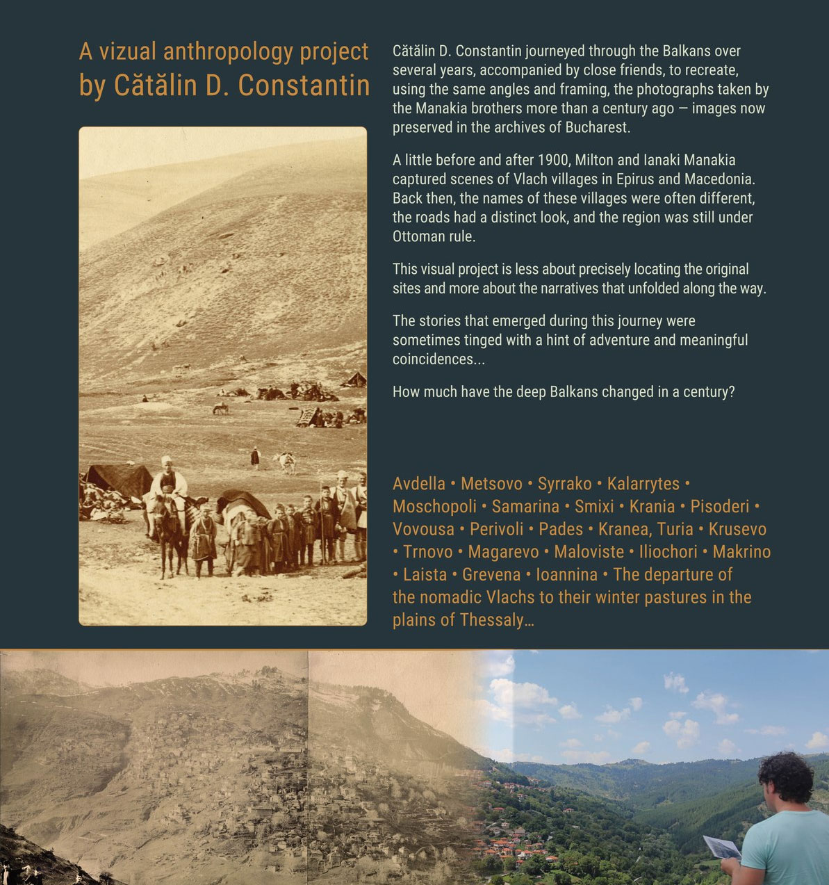 Με αρχειακές φωτογραφίες στα χέρια –οι οποίες σήμερα φυλάσσονται στα αρχεία του Βουκουρεστίου–, παλιούς χάρτες και μαρτυρίες κατοίκων, ο Constantin ήρθε επανειλημμένα στην Ελλάδα αναζητώντας τα ακριβή σημεία όπου ο Μίλτος και ο Γιάννης Μανάκια απαθανάτισαν, στις αρχές του 20ού αιώνα, έναν κόσμο που βρισκόταν στο μεταίχμιο της αλλαγής. Από την Αβδέλλα και τη Σαμαρίνα μέχρι το Μέτσοβο, τα Γρεβενά και τα Ιωάννινα, φωτογράφισε ξανά τα ίδια μέρη, από την ίδια γωνία, επιχειρώντας τη σύγκριση ενός αιώνα. Το αποτέλεσμα είναι εντυπωσιακό: δίπλα στις παλιές ασπρόμαυρες εικόνες στέκονται οι σύγχρονες φωτογραφίες, αποκαλύπτοντας τι χάθηκε, τι άλλαξε και τι επέμεινε να μένει ζωντανό. «Ο στόχος μου δεν ήταν ποτέ απλώς να αναδημιουργήσω φωτογραφίες εκατό ετών με το ίδιο κάδρο. Αυτό ήταν ένας τρόπος να εισέλθω σε αυτές τις απομονωμένες βαλκανικές κοινότητες και να γνωρίσω τη ζωή τους σήμερα, όχι χθες», τονίζει ο δημιουργός, εξηγώντας γιατί έδωσε στο έργο του τον τίτλο «Beyond Yesterday».