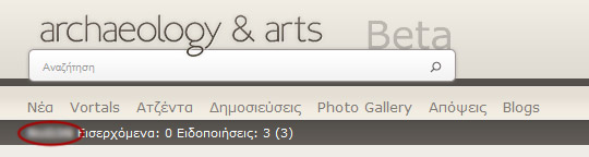 Με την εγγραφή του χρήστη στον δικτυακό τόπο Archaeology & Arts, εμφανίζονται περισσότερες δυνατότητες όπως και η προσωπική σελίδα του χρήστη. Στην γκρι μπάρα που ακολουθεί πάντα τον χρήστη στον ιστότοπο εμφανίζεται το όνομα του χρήστη, τα μηνύματά του και οι ειδοποιήσεις του. Επίσης εμφανίζονται και δύο menu. Κάνοντας κλικ πάνω στο όνομα χρήστη, ανοίγει η προσωπική του σελίδα του χρήστη.