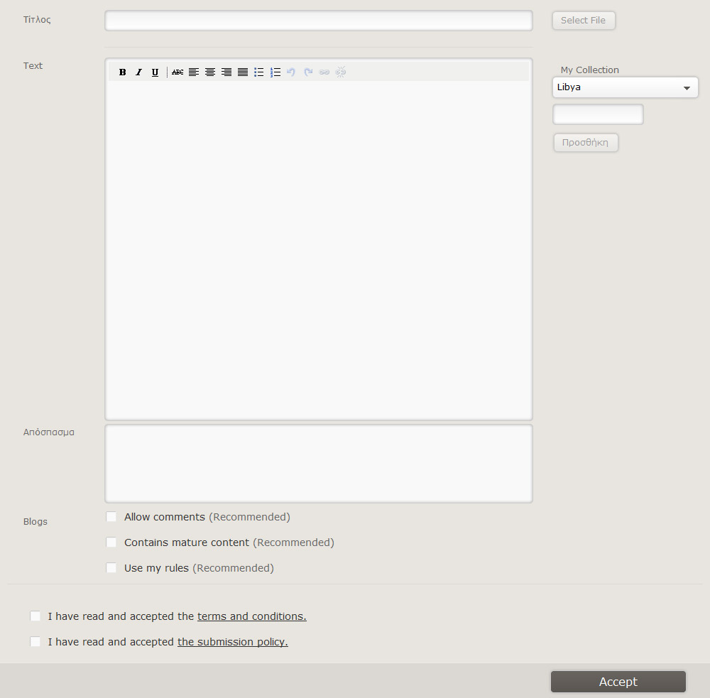Τα πεδία που αφορούν τους όρους και τις προϋποθέσεις καθώς και την πολιτική υποβολής επιλέγονται υποχρεωτικά από το χρήστη, αν επιθυμεί να συνεχίσει να συνεργάζεται με τον δικτυακό τόπο Archaeology & Arts.