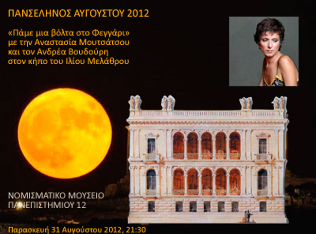 Το Νομισματικό Μουσείο συμμετέχει στον εορτασμό της Πανσελήνου του Αυγούστου με τη μουσική εκδήλωση «Πάμε μια βόλτα στο φεγγάρι». Την τελευταία μέρα του καλοκαιριού που συμπίπτει με τη σπάνια δεύτερη πανσέληνο του Αυγούστου, η Αναστασία Μουτσάτσου θα ερμηνεύσει αγαπημένα τραγούδια με τη συνοδεία του Ανδρέα Βουδούρη στο πιάνο.