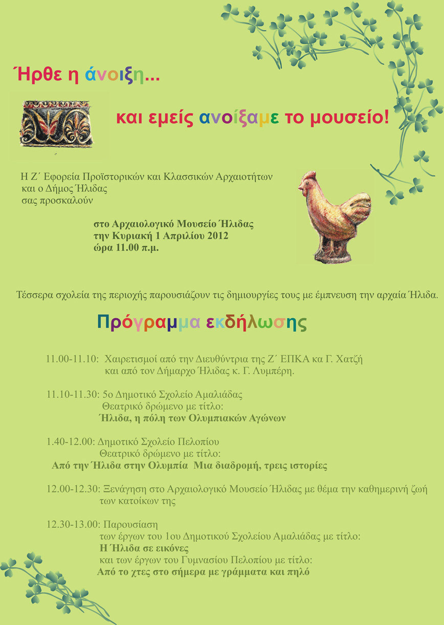 Τέσσερα σχολεία της Ηλείας παρουσιάζουν δημιουργίες τους – θεατρικά δρώμενα, εκθέσεις ζωγραφικής και αντικειμένων – με έμπνευση την αρχαία Ήλιδα.