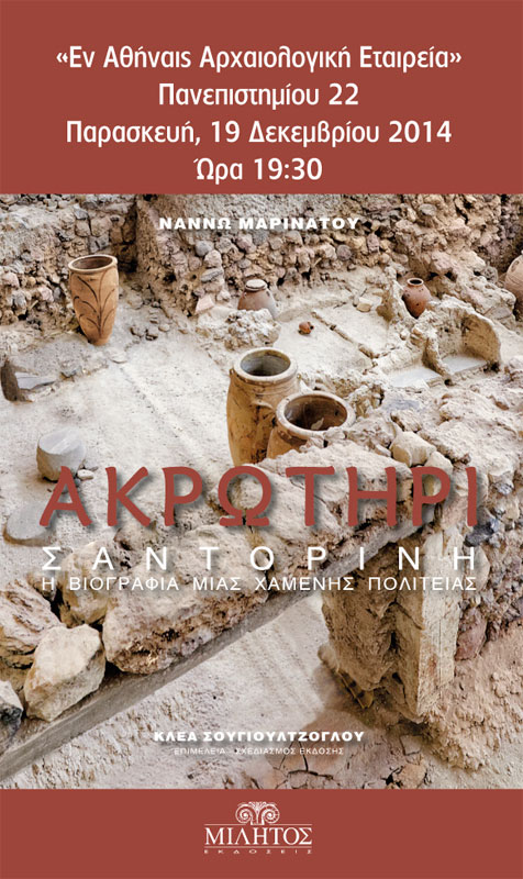 Παρουσίαση της αφιερωματικής έκδοσης της Ναννώς Μαρινάτου «Ακρωτήρι – η βιογραφία μιας χαμένης πολιτείας» διοργανώνουν οι εκδόσεις Μίλητος.