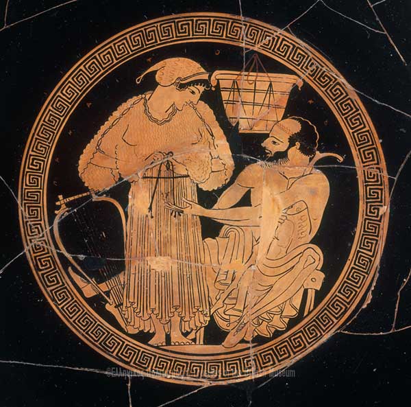 Κύλικα. 510-500 π.Χ. Βρετανικό Μουσείο. Στο αριστερό μέρος της παράστασης διακρίνεται μία βάρβιτος.