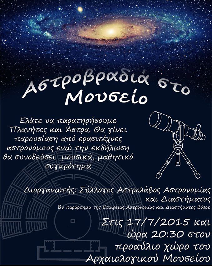 Αστροβραδιά στο Αρχαιολογικό Μουσείο Άρτας συνδιοργανώνουν ο Δήμος Αρταίων μαζί με το Σύλλογο Αστρονομίας Άρτας «Αστρολάβος Αστρονομίας και Διαστήματος», παράρτημα της Εταιρείας Αστρονομίας και Διαστήματος Βόλου, την Εφορεία Αρχαιοτήτων Άρτας και την Περιφέρεια Ηπείρου.